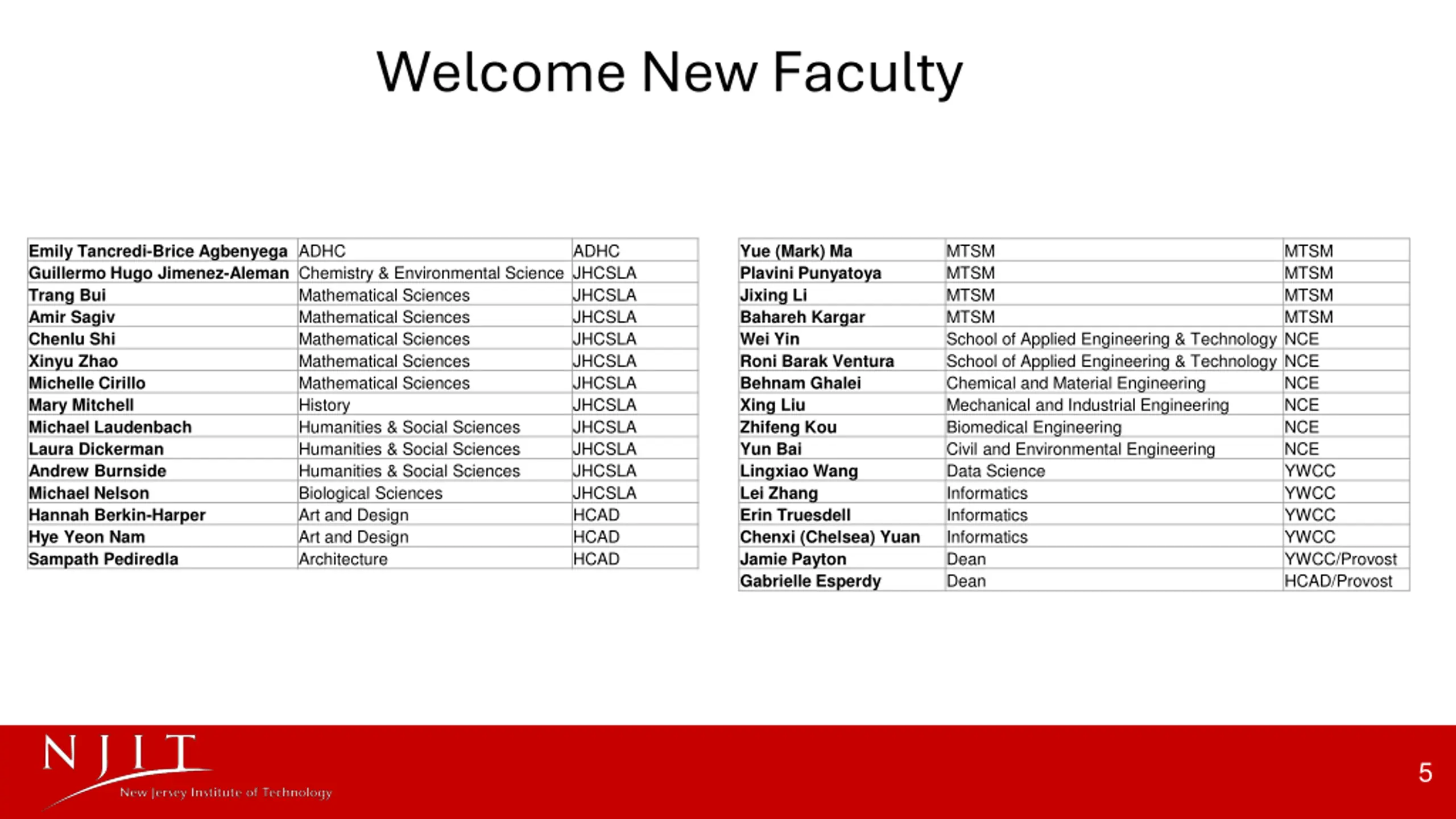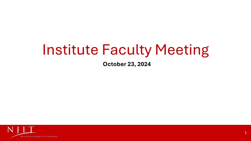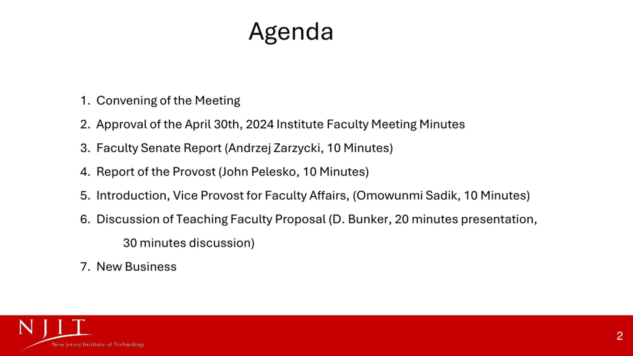 Agenda 1. Convening of the Meeting 2. Approval of the April 30th, 2024 Institute Faculty Meeting Minutes 3. Faculty Senate Report (Andrzej Zarzycki, 10 Minutes) 4. Report of the Provost (John Pelesko, 10 Minutes) 5. Introduction, Vice Provost for Faculty Affairs, (Omowunmi Sadik, 10 Minutes) 6. Discussion of Teaching Faculty Proposal (D. Bunker, 20 minutes presentation, 30 minutes discussion) 7. New Business 2