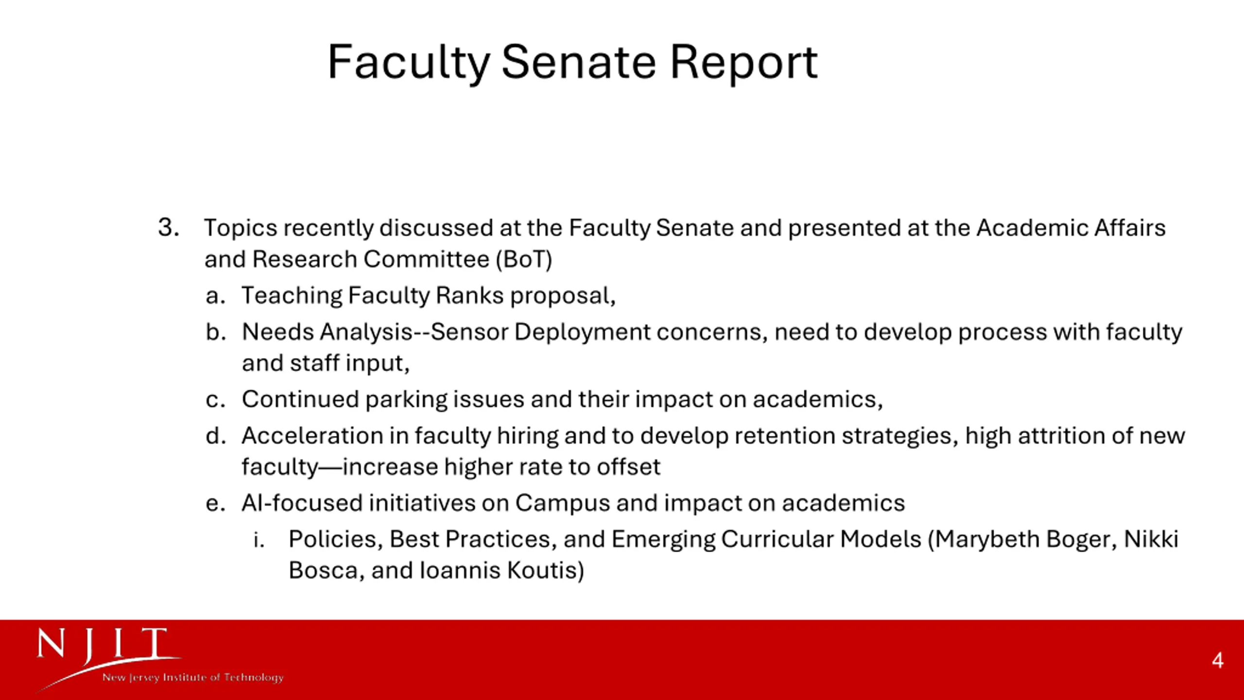 Faculty Senate Report 3. Topics recently discussed at the Faculty Senate and presented at the Academic Affairs and Research Committee (BoT) a. Teaching Faculty Ranks proposal, b. Needs Analysis--Sensor Deployment concerns, need to develop process with faculty and staff input, c. Continued parking issues and their impact on academics, d. Acceleration in faculty hiring and to develop retention strategies, high attrition of new faculty increase higher rate to offset e. AI-focused initiatives on Campus and impact on academics i. Policies, Best Practices, and Emerging Curricular Models (Marybeth Boger, Nikki Bosca, and Ioannis Koutis) 4