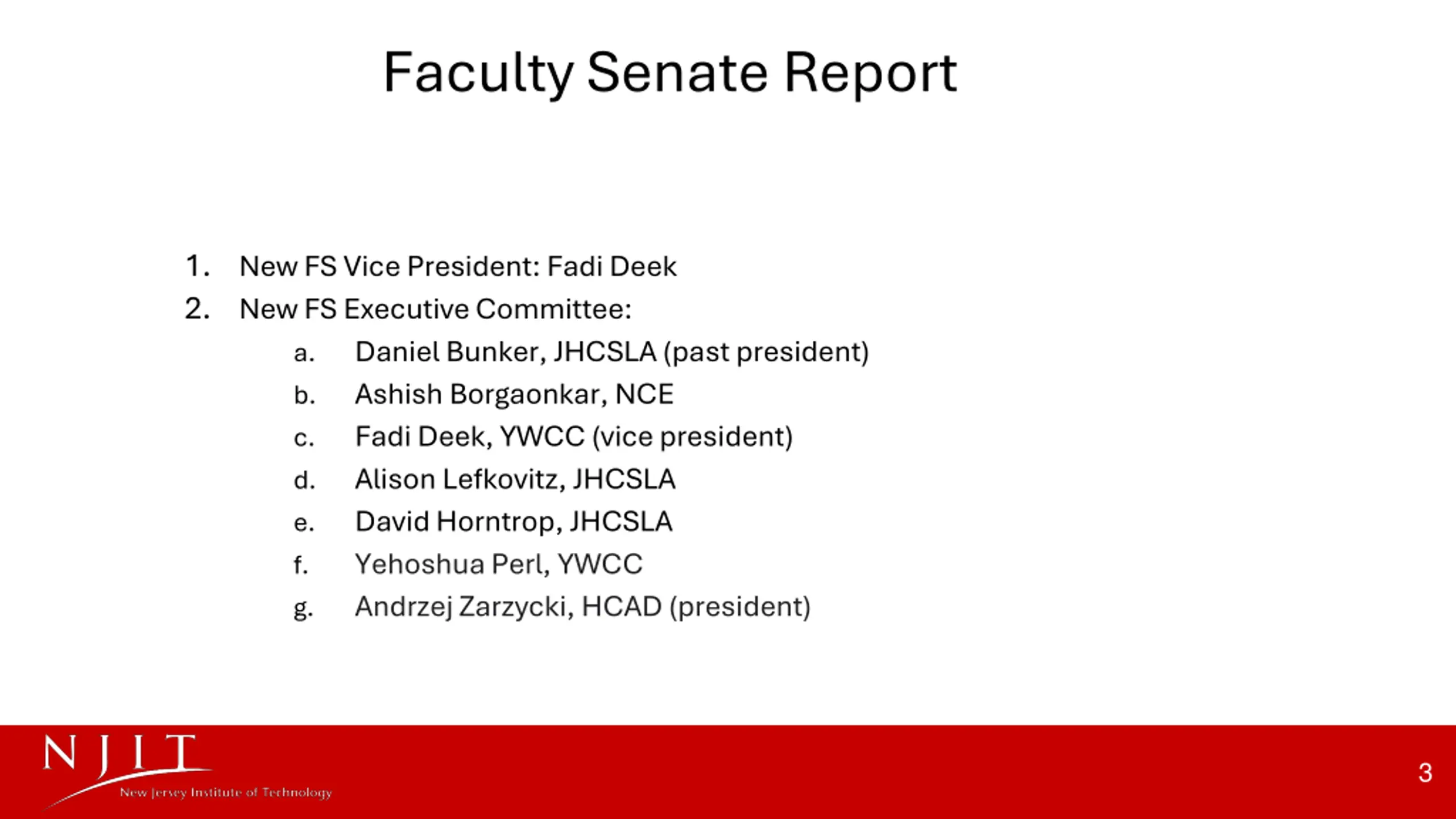 Faculty Senate Report 1. New FS Vice President: FadiDeek 2. New FS Executive Committee: a. Daniel Bunker, JHCSLA (past president) b. Ashish Borgaonkar, NCE c. Fadi Deek, YWCC (vice president) d. Alison Lefkovitz, JHCSLA e. David Horntrop, JHCSLA f. Yehoshua Perl, YWCC g. Andrzej Zarzycki, HCAD (president) 3