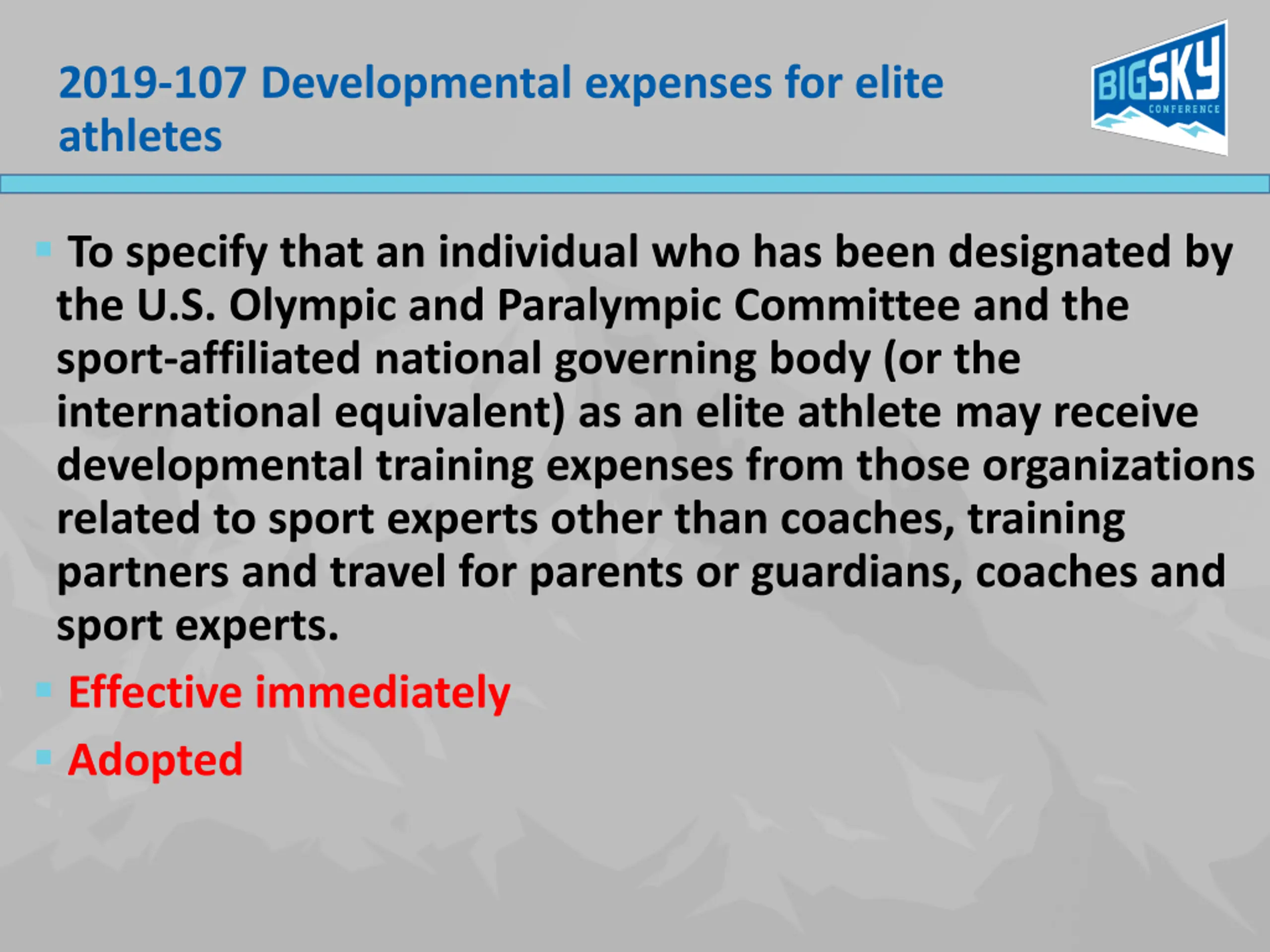 2019-107 Developmental expenses for elite athletes To specify that an individual who has been designated by the U.S. Olympic and Paralympic Committee and the sport-affiliated national governing body (or the international equivalent) as an elite athlete may receive developmental training expenses from those organizations related to sport experts other than coaches, training partners and travel for parents or guardians, coaches and sport experts. Effective immediately Adopted