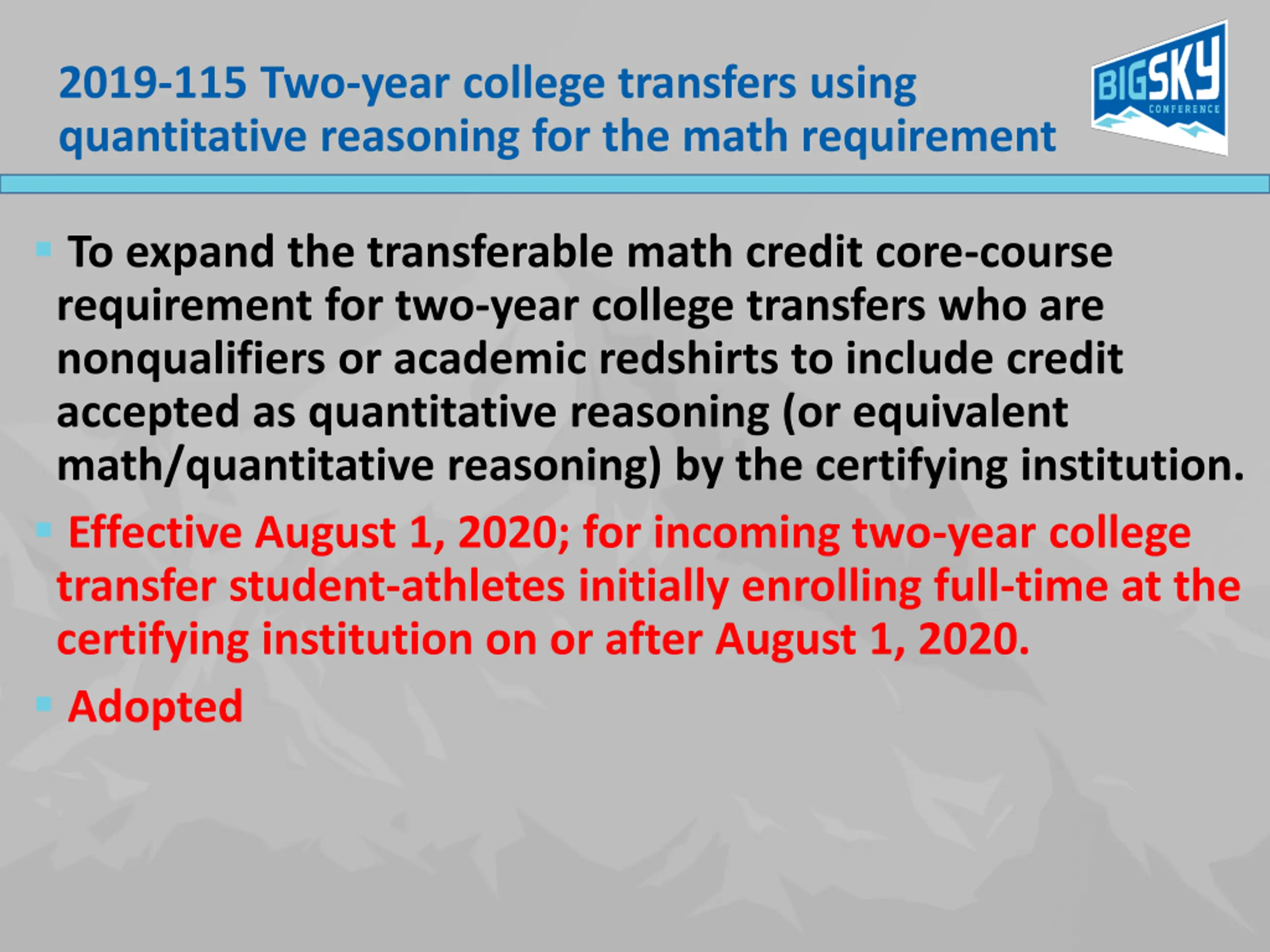 2019-115 Two-year college transfers using quantitative reasoning for the math requirement To expand the transferable math credit core-course requirement for two-year college transfers who are nonqualifiers or academic redshirts to include credit accepted as quantitative reasoning (or equivalent math/quantitative reasoning) by the certifying institution. Effective August 1, 2020; for incoming two-year college transfer student-athletes initially enrolling full-time at the certifying institution on or after August 1, 2020. Adopted