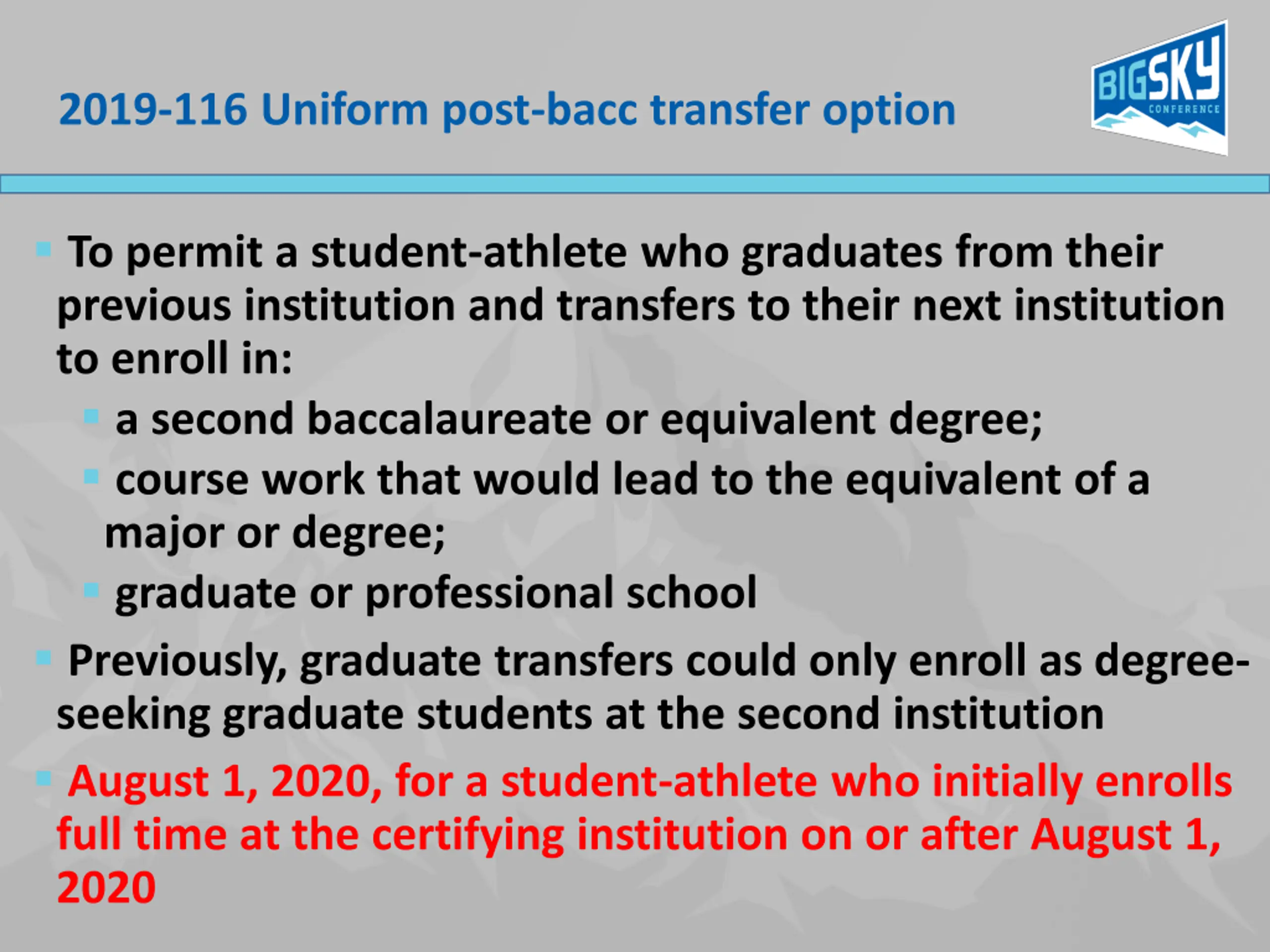 2019-116 Uniform post-bacc transfer option To permit a student-athlete who graduates from their previous institution and transfers to their next institution to enroll in: a second baccalaureate or equivalent degree; course work that would lead to the equivalent of a major or degree; graduate or professional school Previously, graduate transfers could only enroll as degree- seeking graduate students at the second institution August 1, 2020, for a student-athlete who initially enrolls full time at the certifying institution on or after August 1, 2020