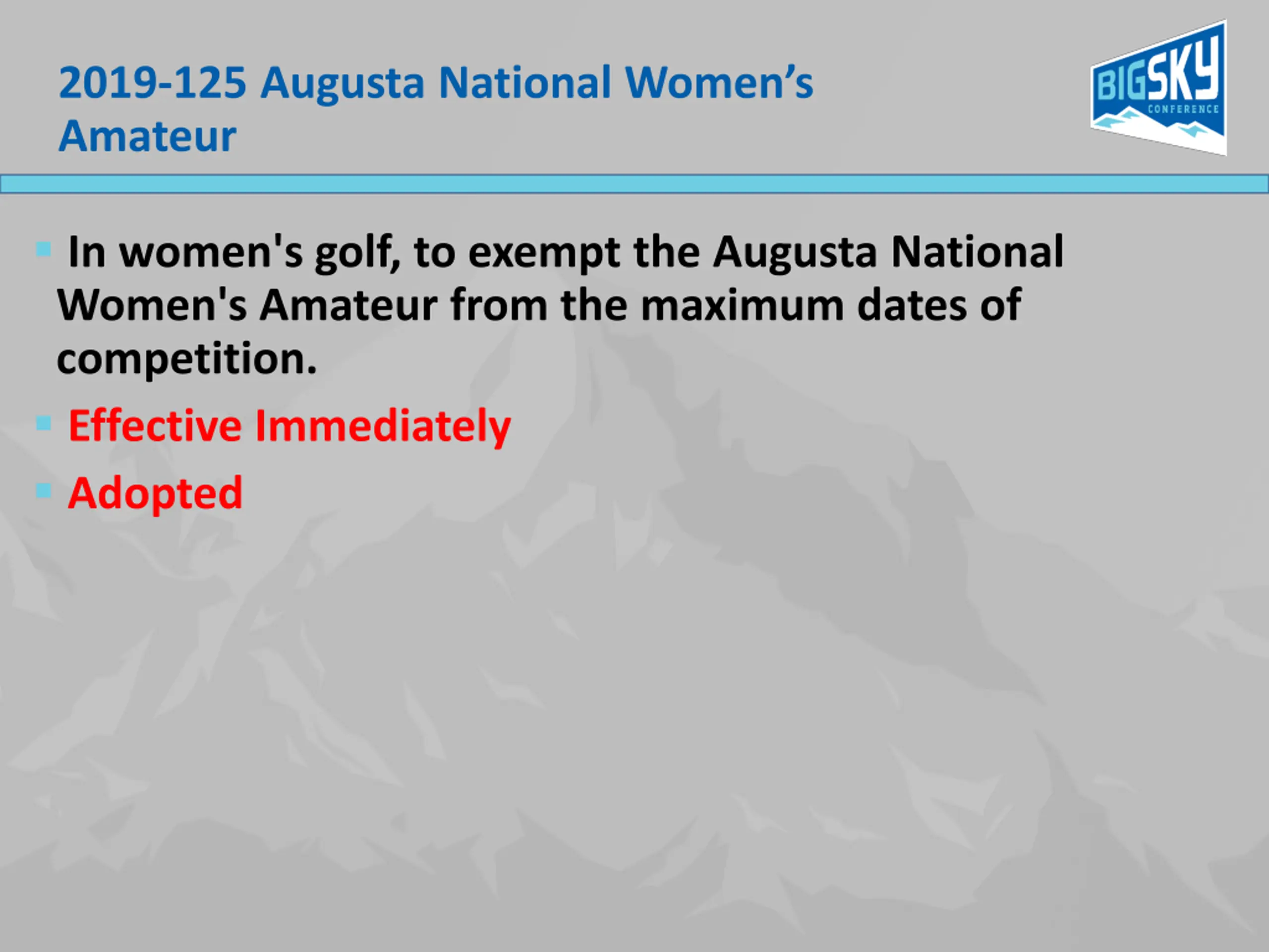 2019-125 Augusta National Womens Amateur In women's golf, to exempt the Augusta National Women's Amateur from the maximum dates of competition. Effective Immediately Adopted
