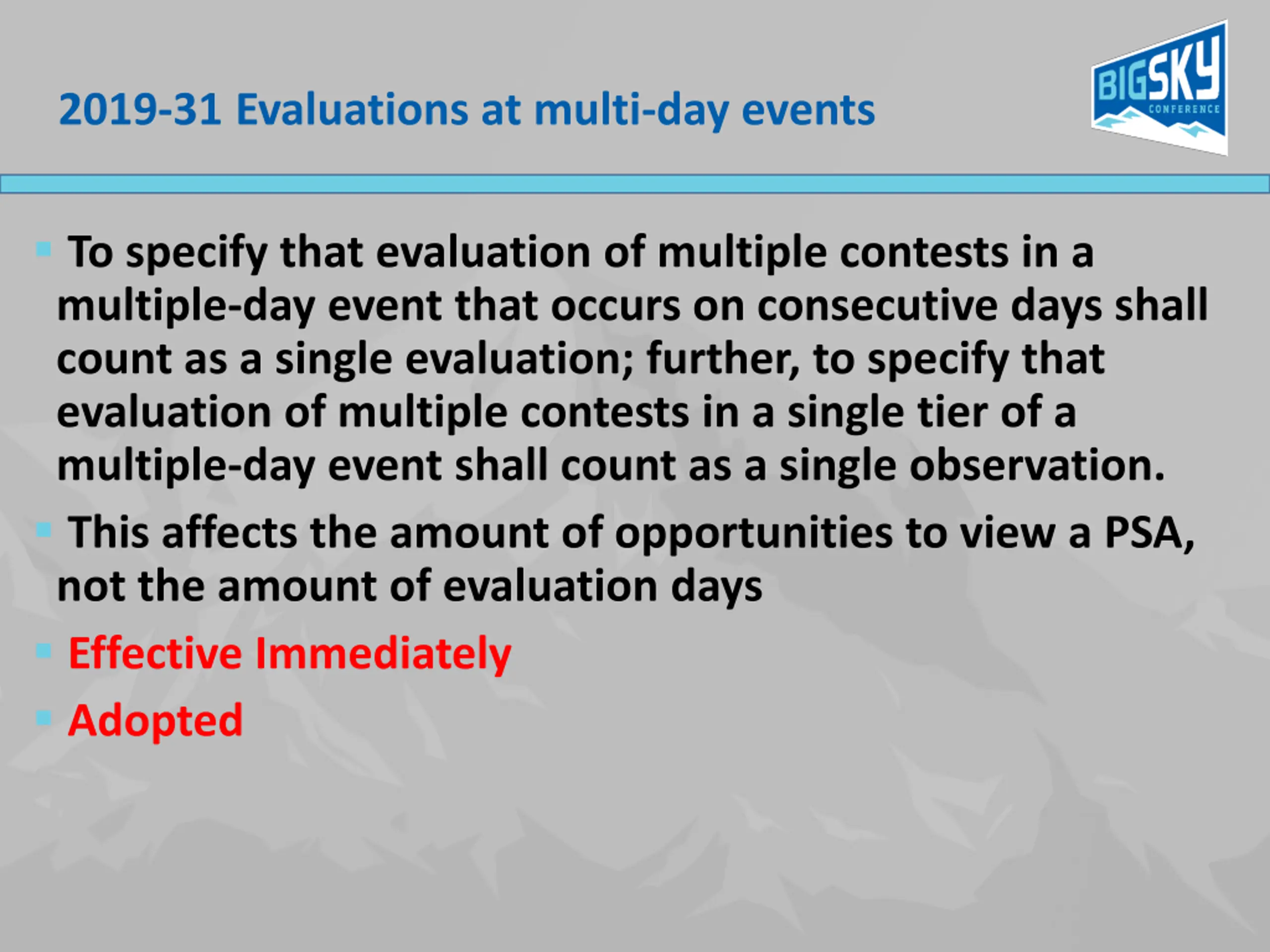 2019-31 Evaluations at multi-day events To specify that evaluation of multiple contests in a multiple-day event that occurs on consecutive days shall count as a single evaluation; further, to specify that evaluation of multiple contests in a single tier of a multiple-day event shall count as a single observation. This affects the amount of opportunities to view a PSA, not the amount of evaluation days Effective Immediately Adopted