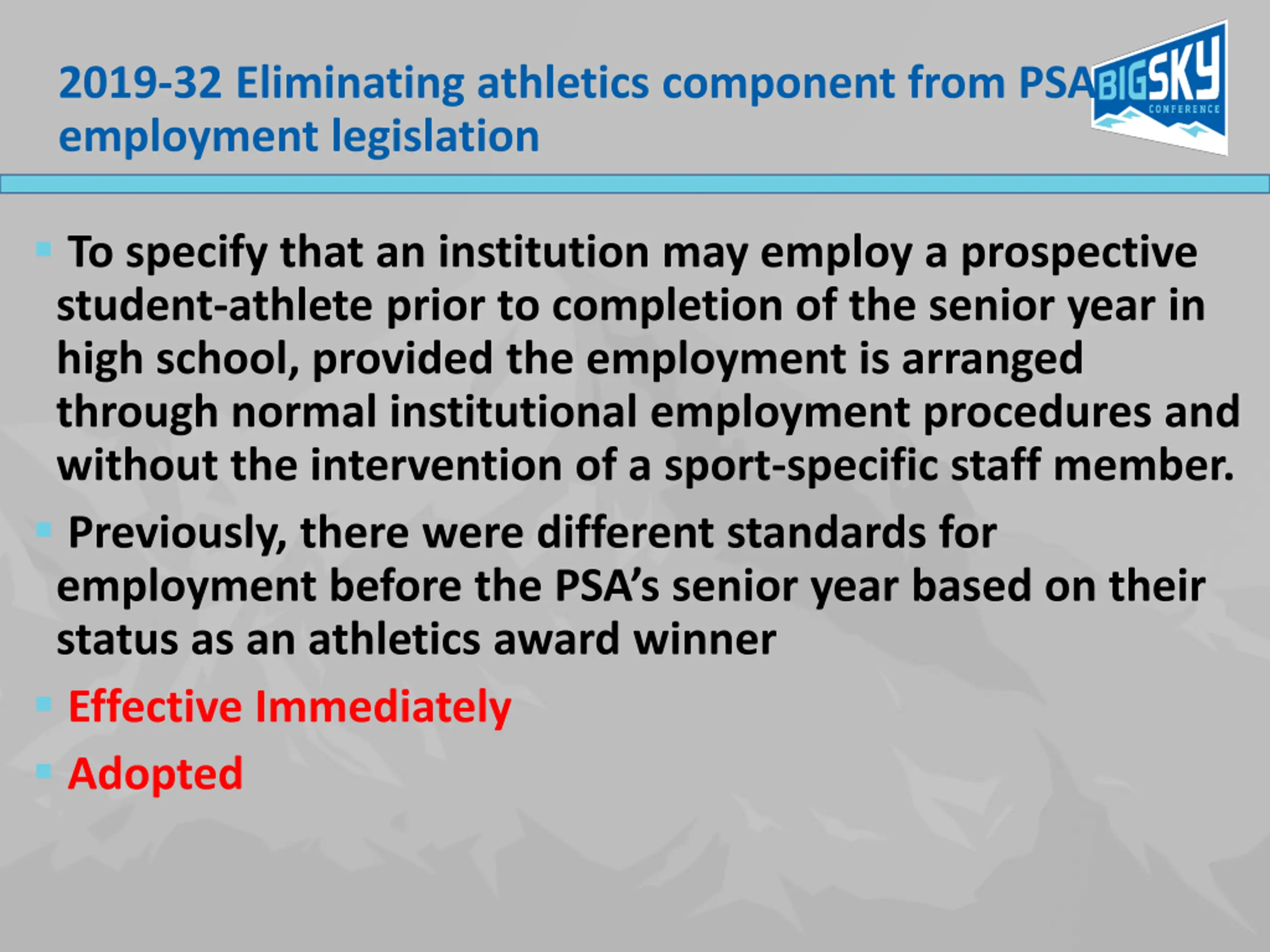 2019-32 Eliminating athletics component from PSA employment legislation To specify that an institution may employ a prospective student-athlete prior to completion of the senior year in high school, provided the employment is arranged through normal institutional employment procedures and without the intervention of a sport-specific staff member. Previously, there were different standards for employment before the PSA s senior year based on their status as an athletics award winner Effective Immediately Adopted