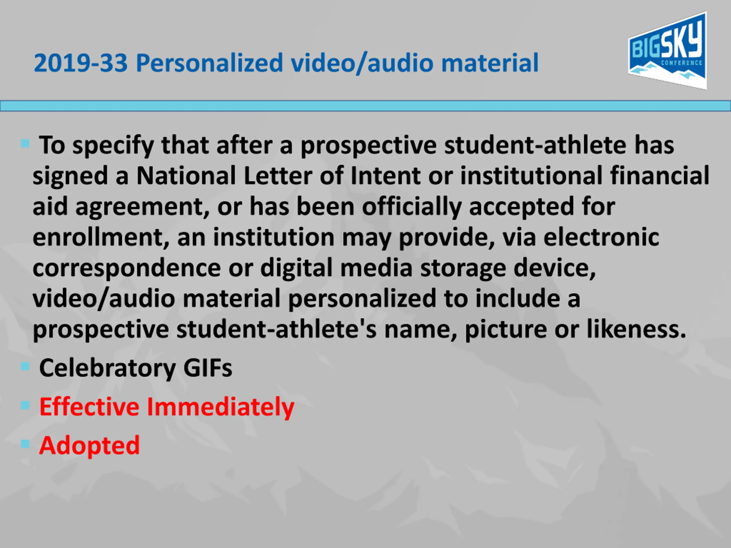 2019-33 Personalized video/audio material To specify that after a prospective student-athlete has signed a National Letter of Intent or institutional financial aid agreement, or has been officially accepted for enrollment, an institution may provide, via electronic correspondence or digital media storage device, video/audio material personalized to include a prospective student-athlete's name, picture or likeness. Celebratory GIFs Effective Immediately Adopted