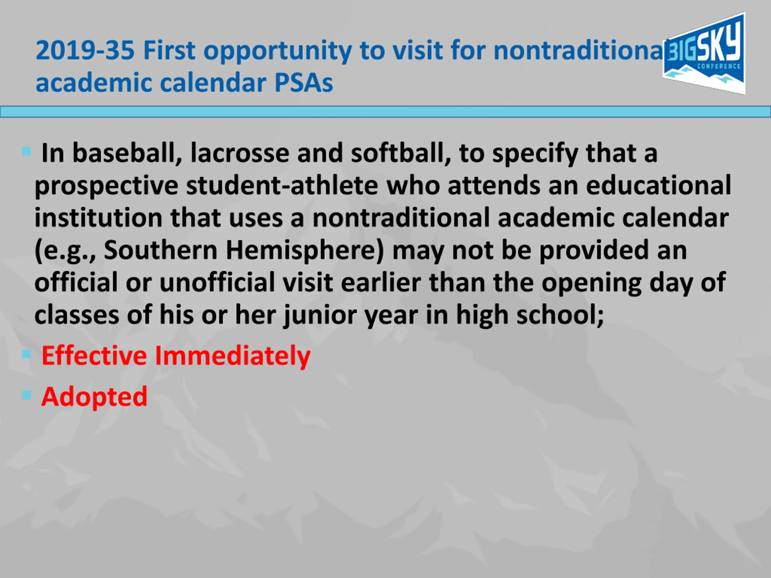 2019-35 First opportunity to visit for nontraditional academic calendar PSAs In baseball, lacrosse and softball, to specify that a prospective student-athlete who attends an educational institution that uses a nontraditional academic calendar (e.g., Southern Hemisphere) may not be provided an official or unofficial visit earlier than the opening day of classes of his or her junior year in high school; Effective Immediately Adopted