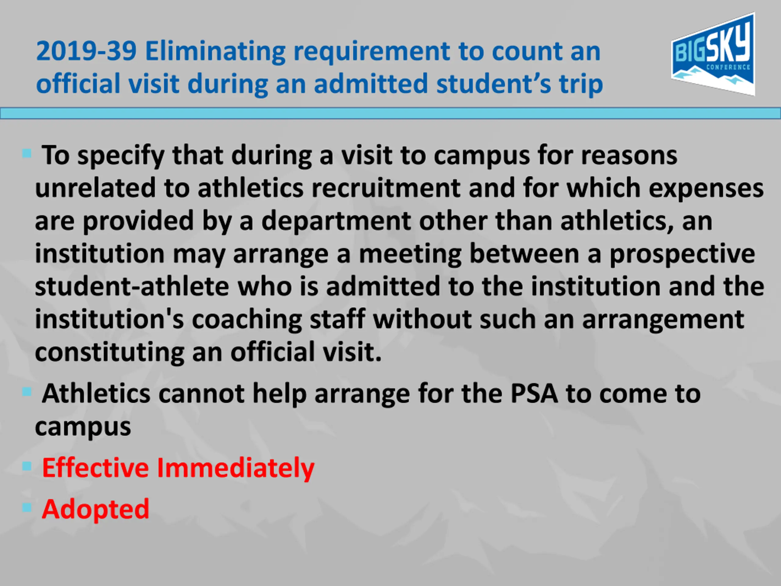 2019-39 Eliminating requirement to count an official visit during an admitted student s trip To specify that during a visit to campus for reasons unrelated to athletics recruitment and for which expenses are provided by a department other than athletics, an institution may arrange a meeting between a prospective student-athlete who is admitted to the institution and the institution's coaching staff without such an arrangement constituting an official visit. Athletics cannot help arrange for the PSA to come to campus Effective Immediately Adopted