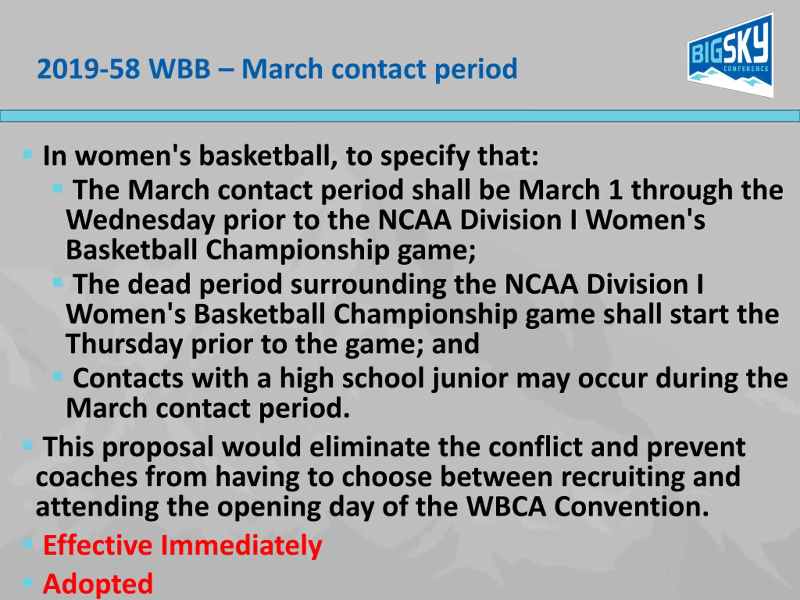 2019-58 WBB March contact period In women's basketball, to specify that: The March contact period shall be March 1 through the Wednesday prior to the NCAA Division I Women's Basketball Championship game; The dead period surrounding the NCAA Division I Women's Basketball Championship game shall start the Thursday prior to the game; and Contacts with a high school junior may occur during the March contact period. This proposal would eliminate the conflict and prevent coaches from having to choose between recruiting and attending the opening day of the WBCA Convention. Effective Immediately Adopted