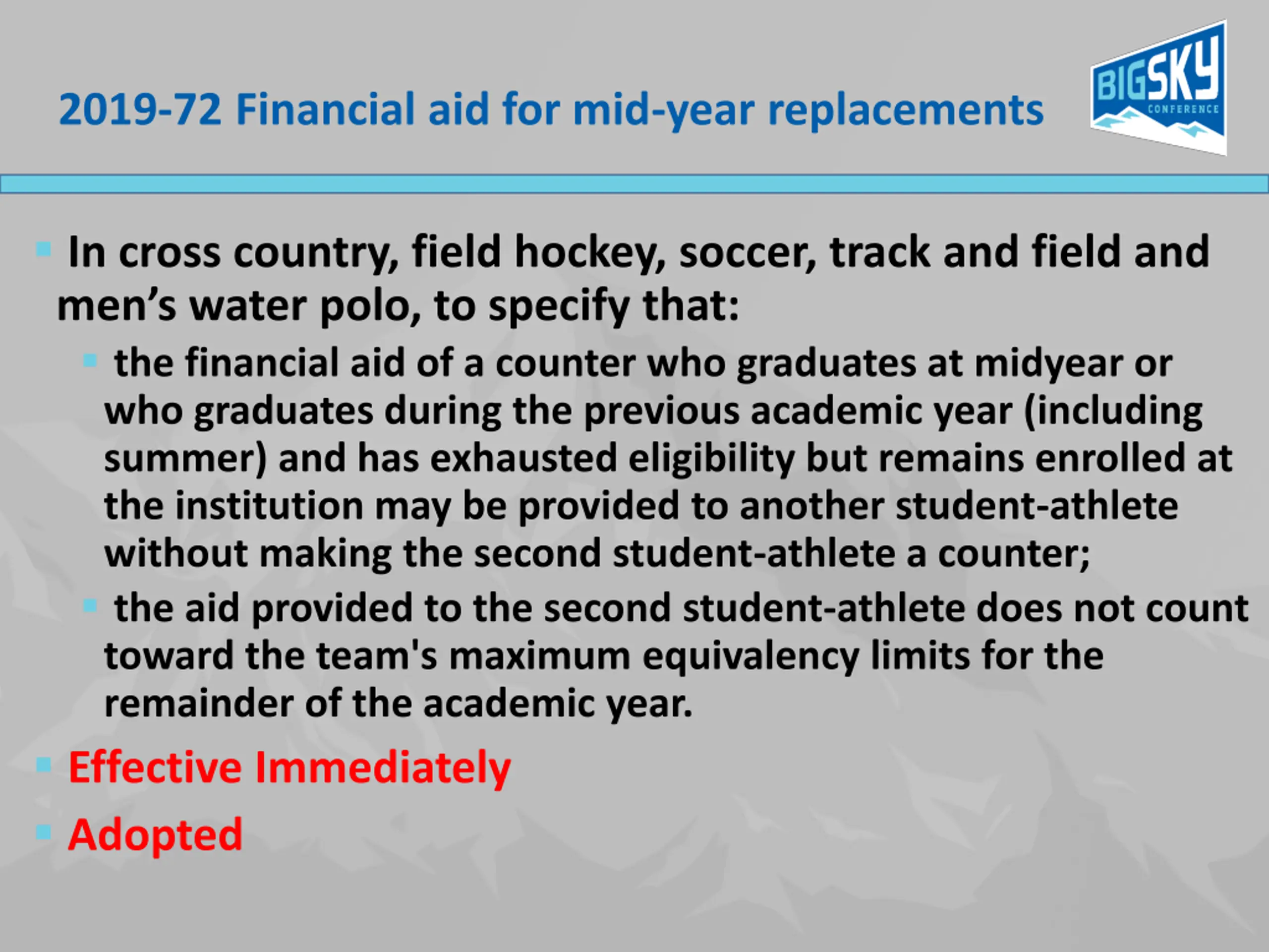 2019-72 Financial aid for mid-year replacements In cross country, field hockey, soccer, track and field and men s water polo, to specify that: the financial aid of a counter who graduates at midyear or who graduates during the previous academic year (including summer) and has exhausted eligibility but remains enrolled at the institution may be provided to another student-athlete without making the second student-athlete a counter; the aid provided to the second student-athlete does not count toward the team's maximum equivalency limits for the remainder of the academic year. Effective Immediately Adopted