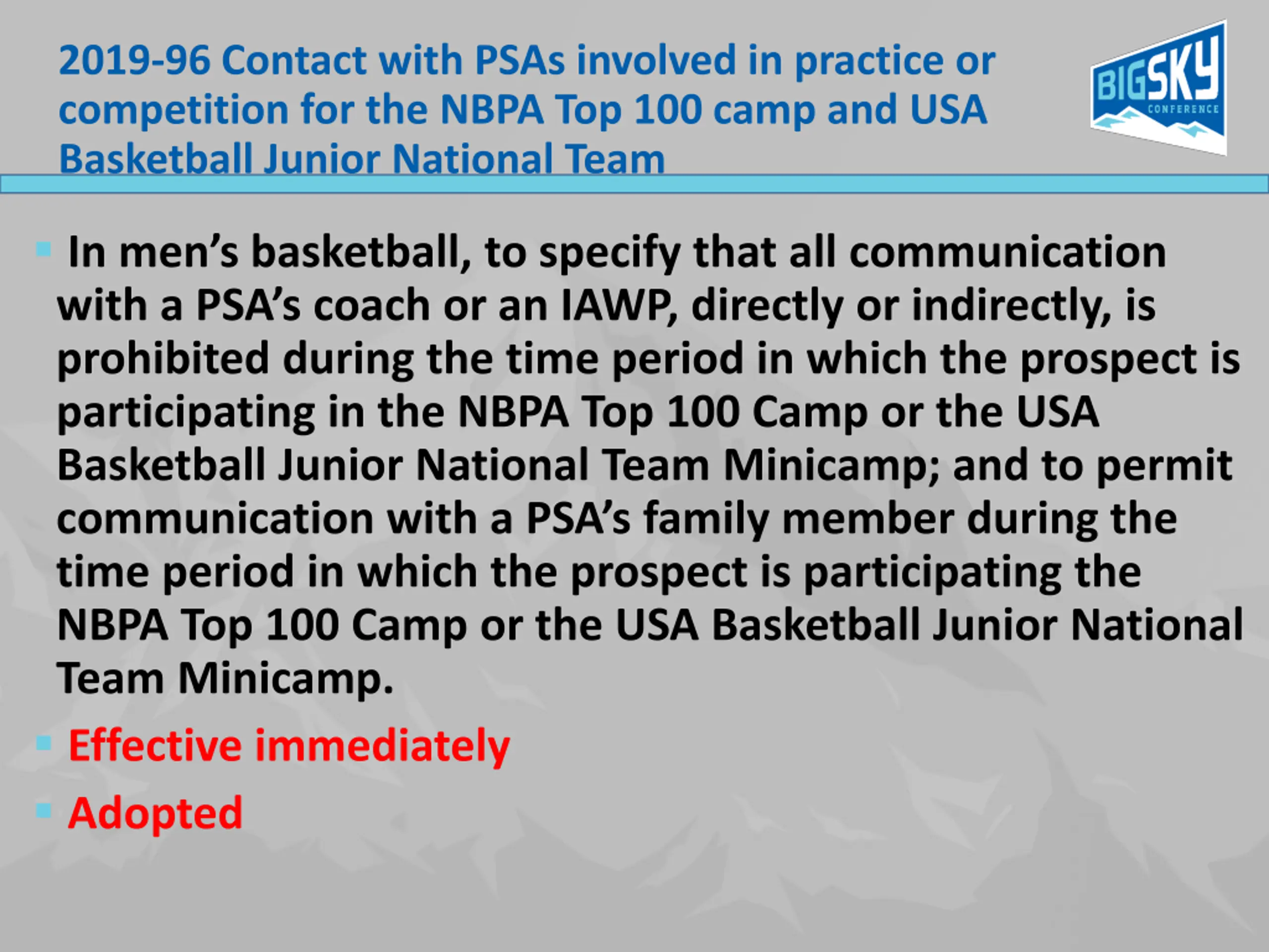2019-96 Contact with PSAs involved in practice or competition for the NBPA Top 100 camp and USA Basketball Junior National Team In men s basketball, to specify that all communication with a PSA s coach or an IAWP, directly or indirectly, is prohibited during the time period in which the prospect is participating in the NBPA Top 100 Camp or the USA Basketball Junior National Team Minicamp; and to permit communication with a PSA s family member during the time period in which the prospect is participating the NBPA Top 100 Camp or the USA Basketball Junior National Team Minicamp. Effective immediately Adopted