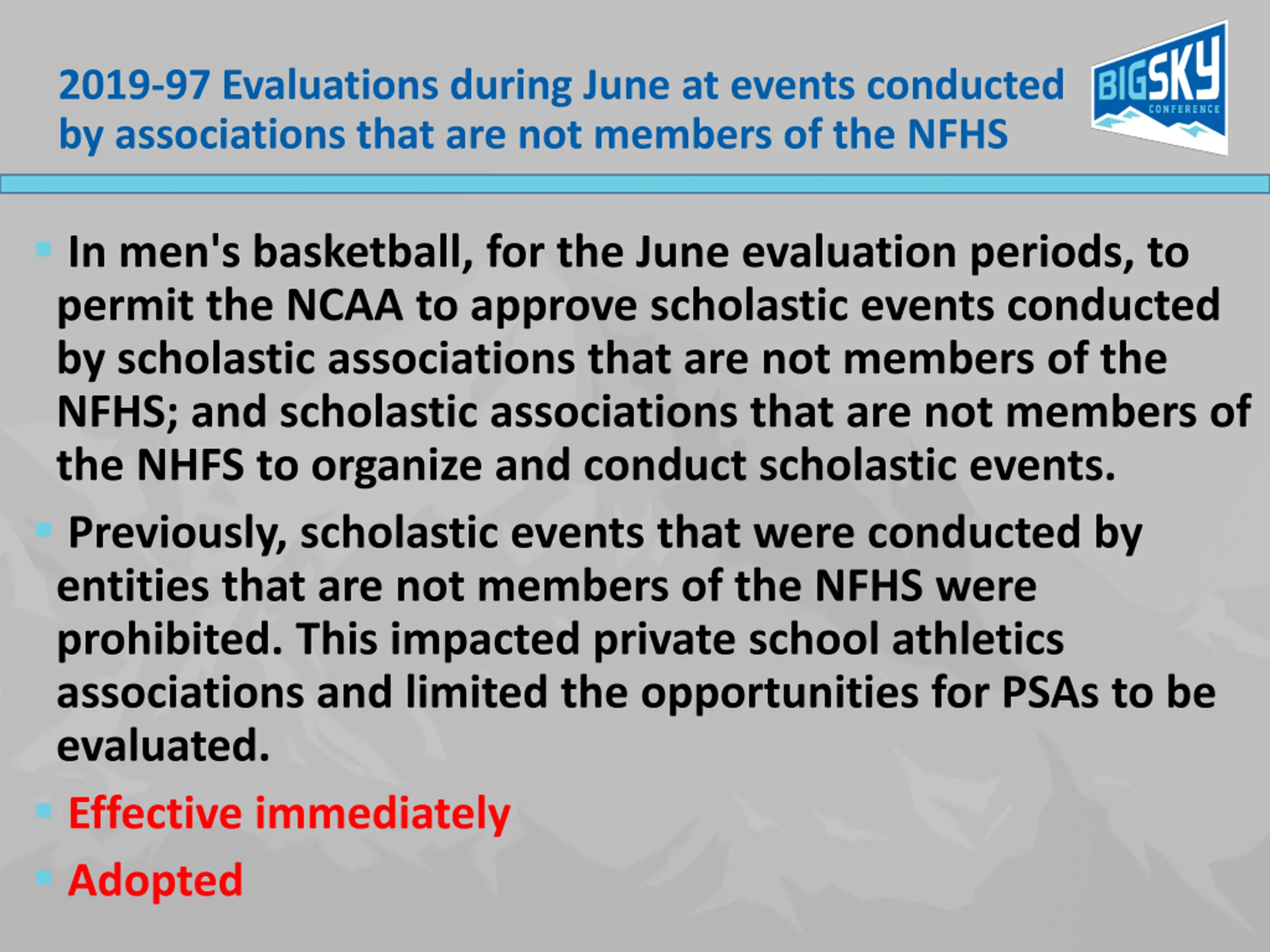 2019-97 Evaluations during June at events conducted by associations that are not members of the NFHS In men's basketball, for the June evaluation periods, to permit the NCAA to approve scholastic events conducted by scholastic associations that are not members of the NFHS; and scholastic associations that are not members of the NHFS to organize and conduct scholastic events. Previously, scholastic events that were conducted by entities that are not members of the NFHS were prohibited. This impacted private school athletics associations and limited the opportunities for PSAs to be evaluated. Effective immediately Adopted