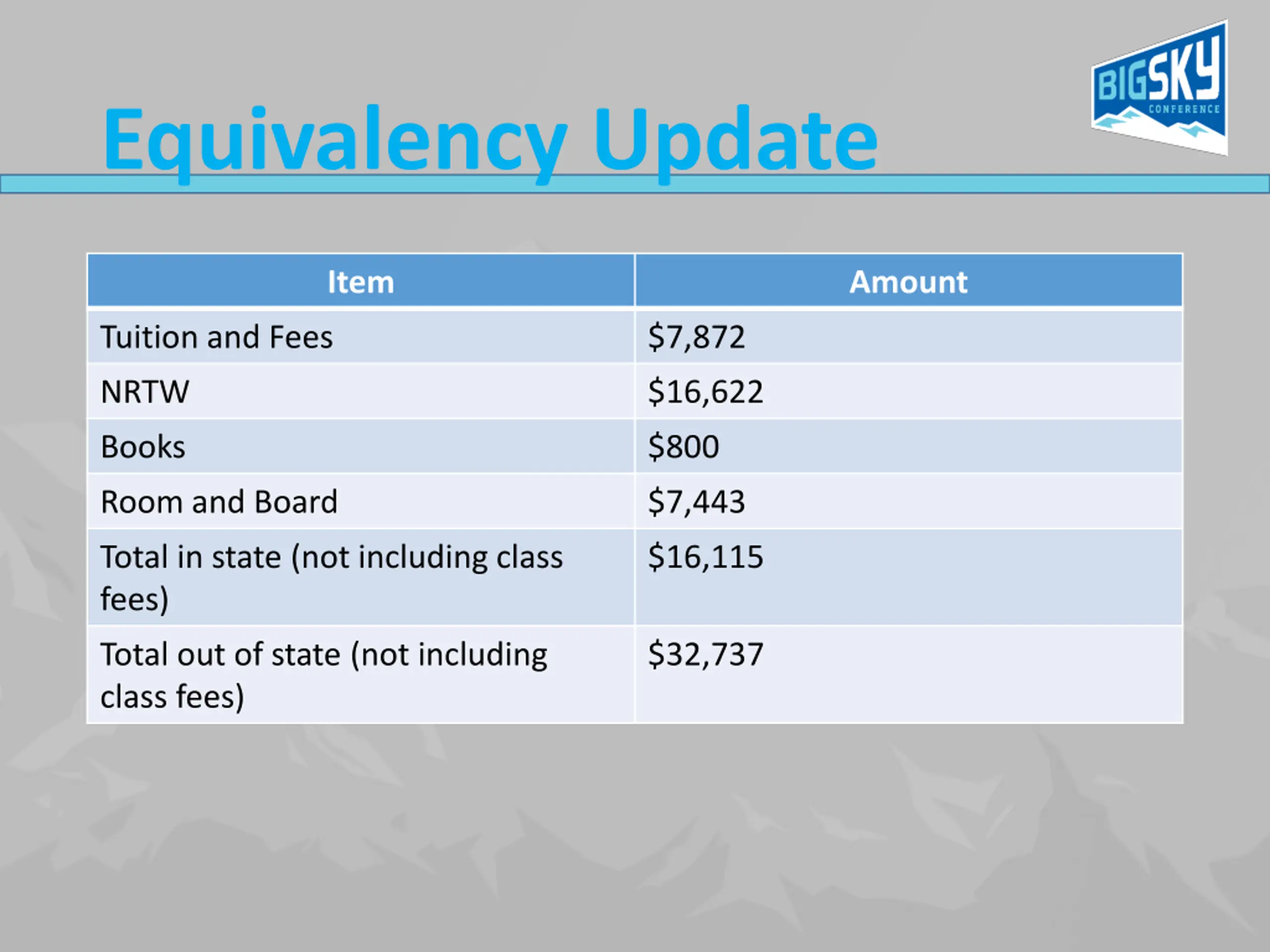 Equivalency Update Item Amount Tuition and Fees $7,872 NRTW $16,622 Books $800 Room and Board $7,443 Total in state (not including class fees) $16,115 Total out of state (not including class fees) $32,737