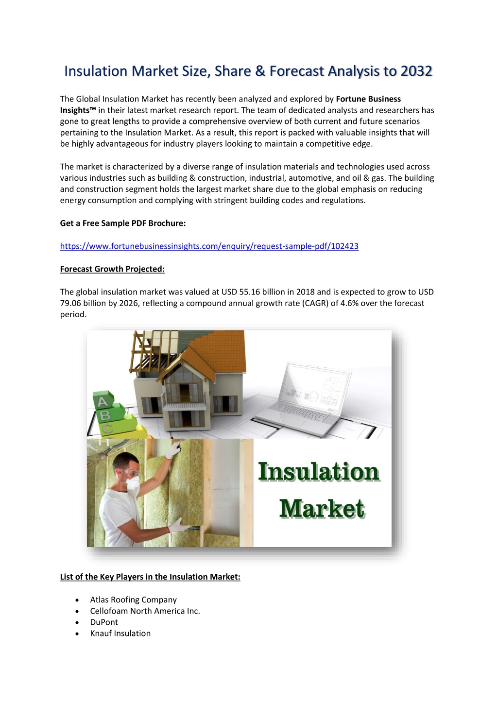 Insulation Market Size, Share & Forecast Analysis to 2032 The Global Insulation Market has recently been analyzed and explored by Fortune Business Insights in their latest market research report. The team of dedicated analysts and researchers has gone to great lengths to provide a comprehensive overview of both current and future scenarios pertaining to the Insulation Market. As a result, this report is packed with valuable insights that will be highly advantageous for industry players looking to maintain a competitive edge. The market is characterized by a diverse range of insulation materials and technologies used across various industries such as building & construction, industrial, automotive, and oil & gas. The building and construction segment holds the largest market share due to the global emphasis on reducing energy consumption and complying with stringent building codes and regulations. Get a Free Sample PDF Brochure: https://www.fortunebusinessinsights.com/enquiry/request-sample-pdf/102423 Forecast Growth Projected: The global insulation market was valued at USD 55.16 billion in 2018 and is expected to grow to USD 79.06 billion by 2026, reflecting a compound annual growth rate (CAGR) of 4.6% over the forecast period. List of the Key Players in the Insulation Market: Atlas Roofing Company Cellofoam North America Inc. DuPont Knauf Insulation