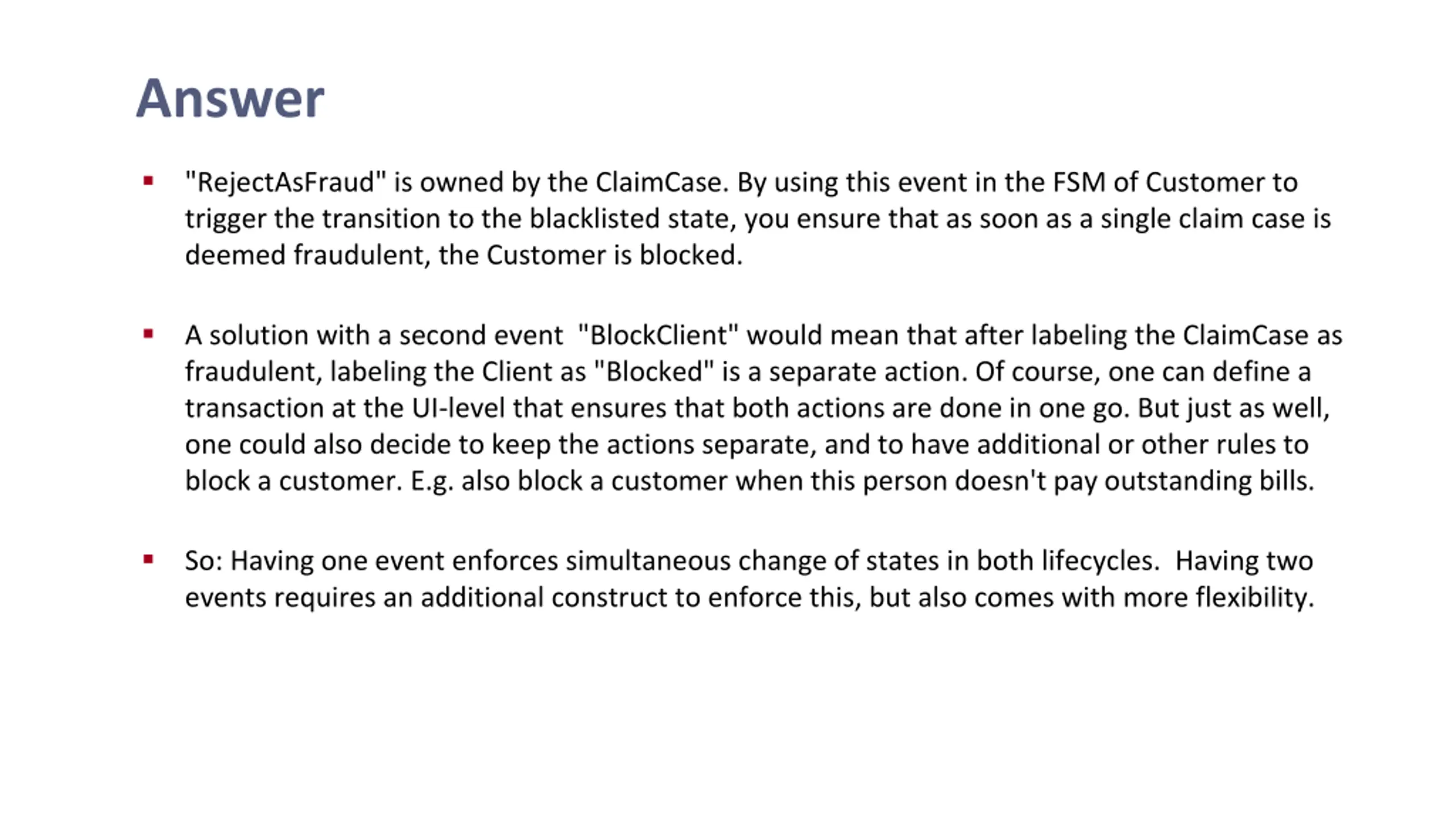 Answer "RejectAsFraud" is owned by the ClaimCase. By using this event in the FSM of Customer to trigger the transition to the blacklisted state, you ensure that as soon as a single claim case is deemed fraudulent, the Customer is blocked. A solution with a second event "BlockClient" would mean that after labeling the ClaimCase as fraudulent, labeling the Client as "Blocked" is a separate action. Of course, one can define a transaction at the UI-level that ensures that both actions are done in one go. But just as well, one could also decide to keep the actions separate, and to have additional or other rules to block a customer. E.g. also block a customer when this person doesn't pay outstanding bills. So: Having one event enforces simultaneous change of states in both lifecycles. Having two events requires an additional construct to enforce this, but also comes with more flexibility.