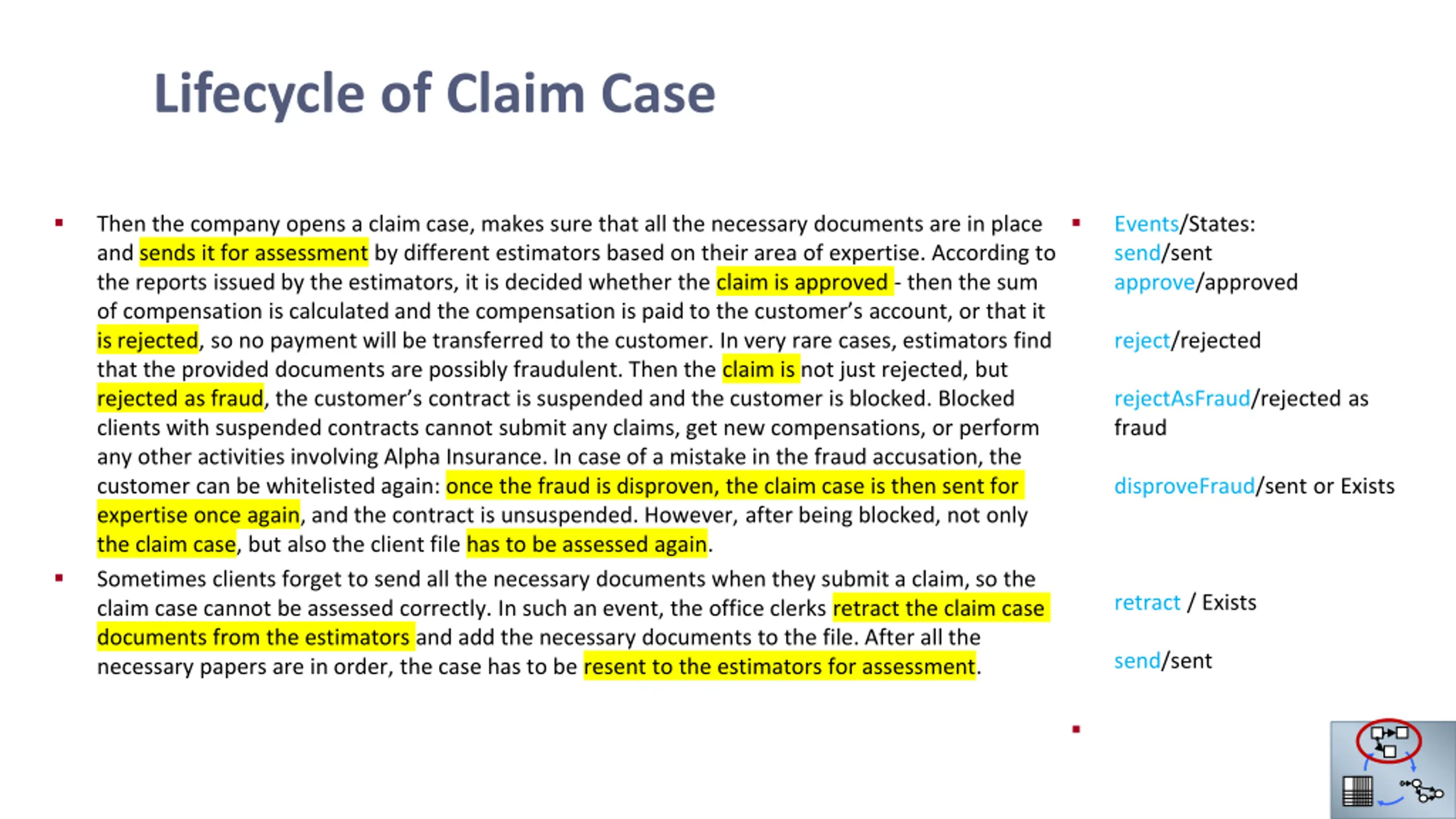 Lifecycle of Claim Case Then the company opens a claim case, makes sure that all the necessary documents are in place and sends it for assessment by different estimators based on their area of expertise. According to the reports issued by the estimators, it is decided whether the claim is approved - then the sum of compensation is calculated and the compensation is paid to the customer s account, or that it is rejected, so no payment will be transferred to the customer. In very rare cases, estimators find that the provided documents are possibly fraudulent. Then the claim is not just rejected, but rejected as fraud, the customer s contract is suspended and the customer is blocked. Blocked clients with suspended contracts cannot submit any claims, get new compensations, or perform any other activities involving Alpha Insurance. In case of a mistake in the fraud accusation, the customer can be whitelisted again: once the fraud is disproven, the claim case is then sent for expertise once again, and the contract is unsuspended. However, after being blocked, not only the claim case, but also the client file has to be assessed again. Sometimes clients forget to send all the necessary documents when they submit a claim, so the claim case cannot be assessed correctly. In such an event, the office clerks retract the claim case documents from the estimators and add the necessary documents to the file. After all the necessary papers are in order, the case has to be resent to the estimators for assessment. Events/States: send/sent approve/approved reject/rejected rejectAsFraud/rejected as fraud disproveFraud/sent or Exists retract / Exists send/sent