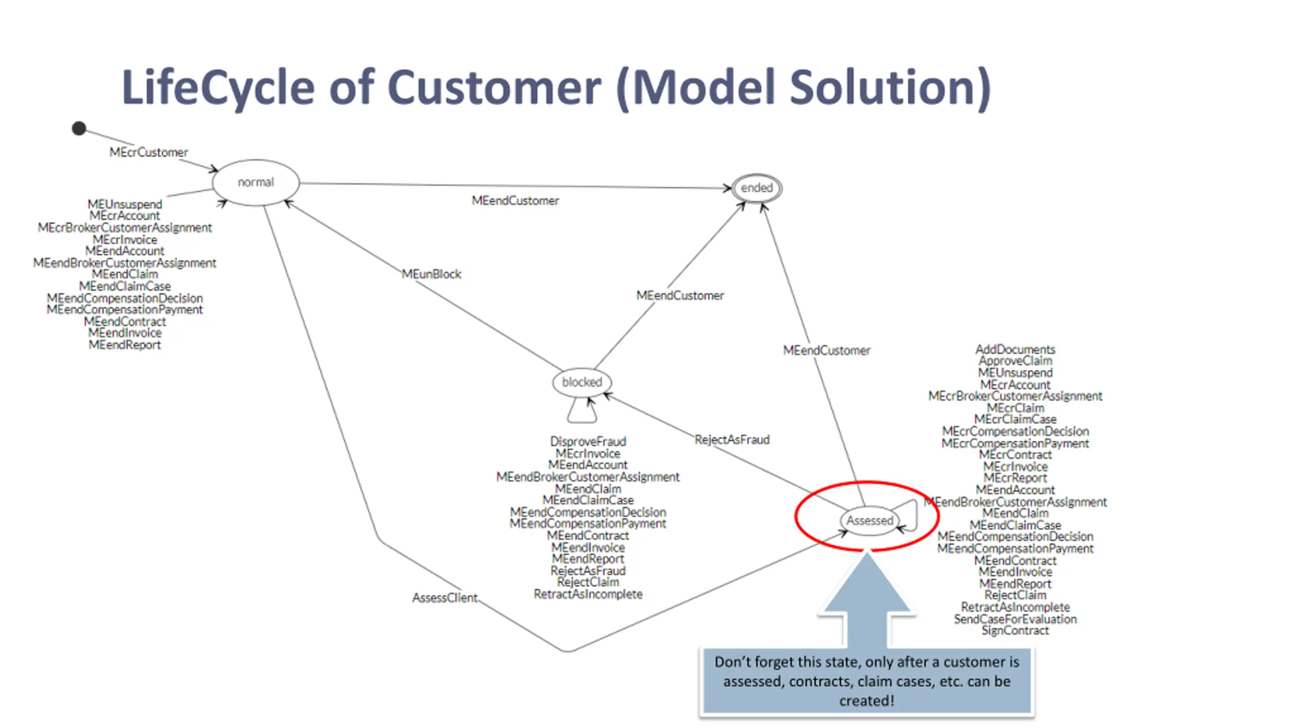 LifeCycle of Customer (Model Solution) Don t forget this state, only after a customer is assessed, contracts, claim cases, etc. can be created!