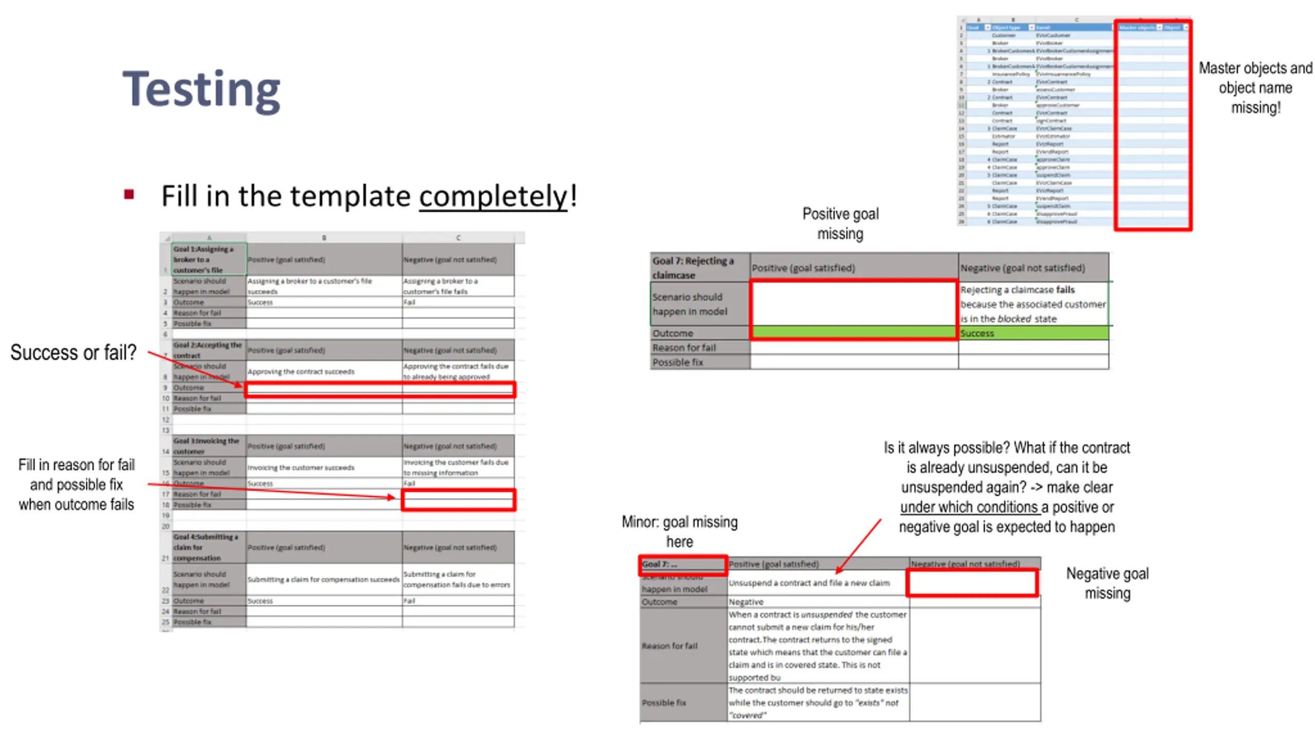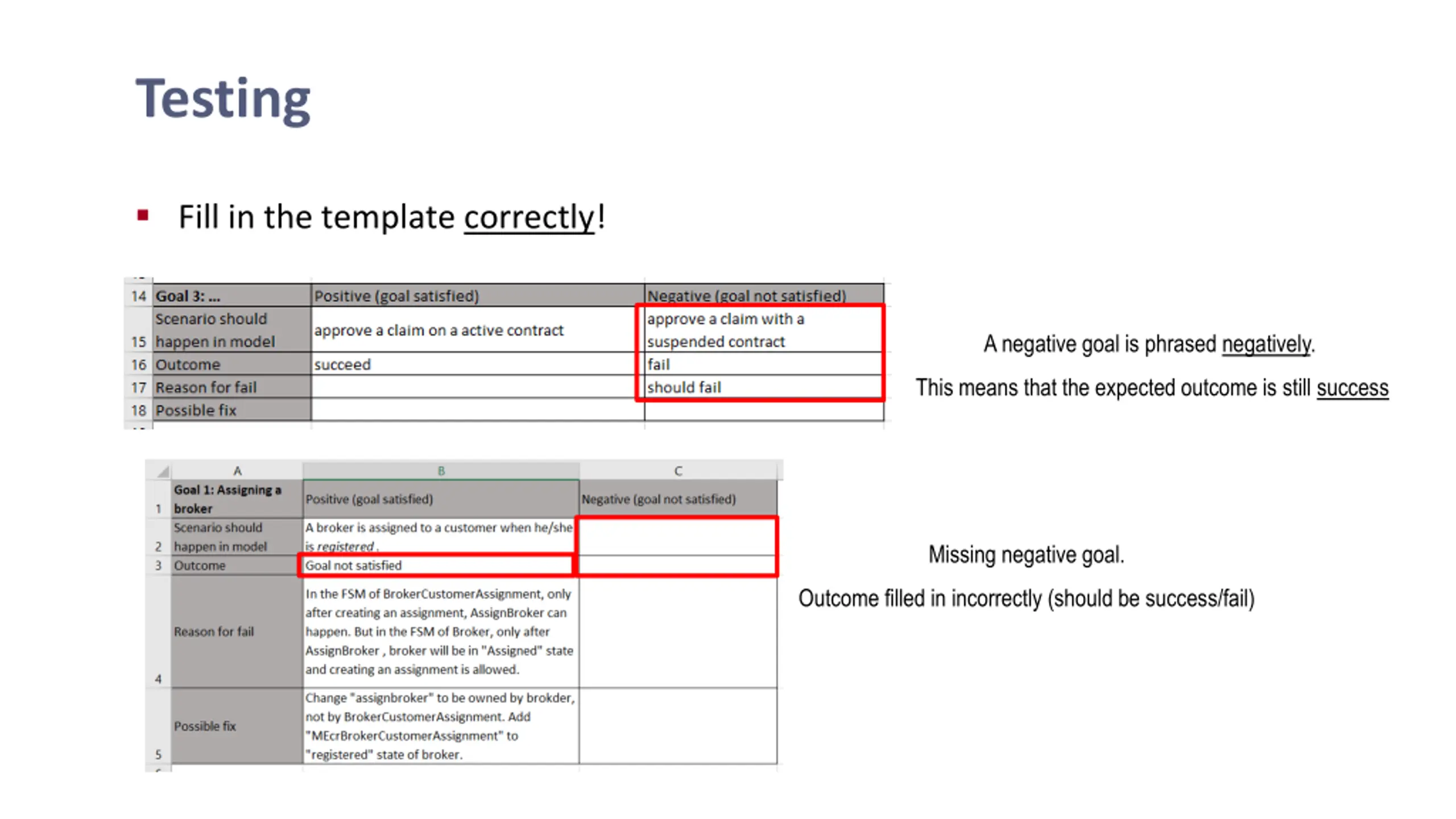 Testing Fill in the template correctly! A negative goal is phrased negatively. This means that the expected outcome is still success Missing negative goal. Outcome filled in incorrectly (should be success/fail)