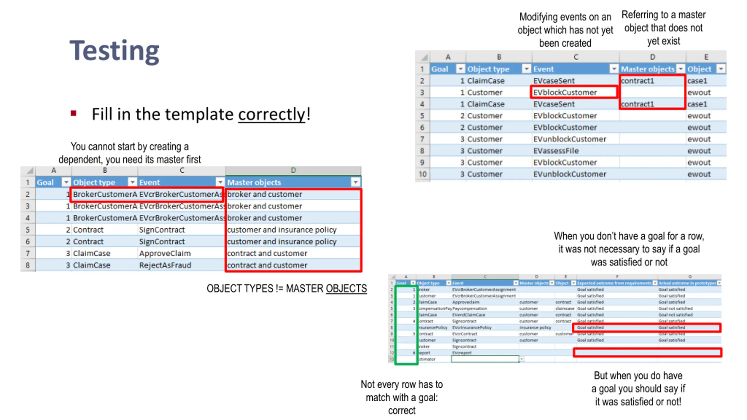Referring to a master object that does not yet exist Modifying events on an object which has not yet been created Testing Fill in the template correctly! You cannot start by creating a dependent, you need its master first When you don t have a goal for a row, it was not necessary to say if a goal was satisfied or not OBJECT TYPES != MASTER OBJECTS But when you do have a goal you should say if it was satisfied or not! Not every row has to match with a goal: correct