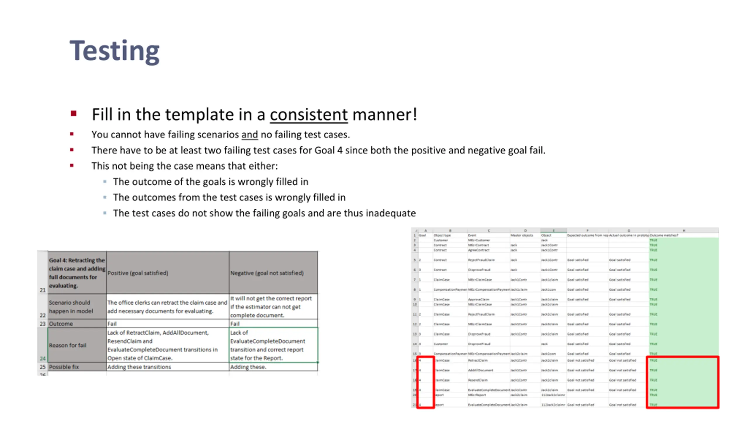 Testing Fill in the template in a consistent manner! You cannot have failing scenarios and no failing test cases. There have to be at least two failing test cases for Goal 4 since both the positive and negative goal fail. This not being the case means that either: The outcome of the goals is wrongly filled in The outcomes from the test cases is wrongly filled in The test cases do not show the failing goals and are thus inadequate