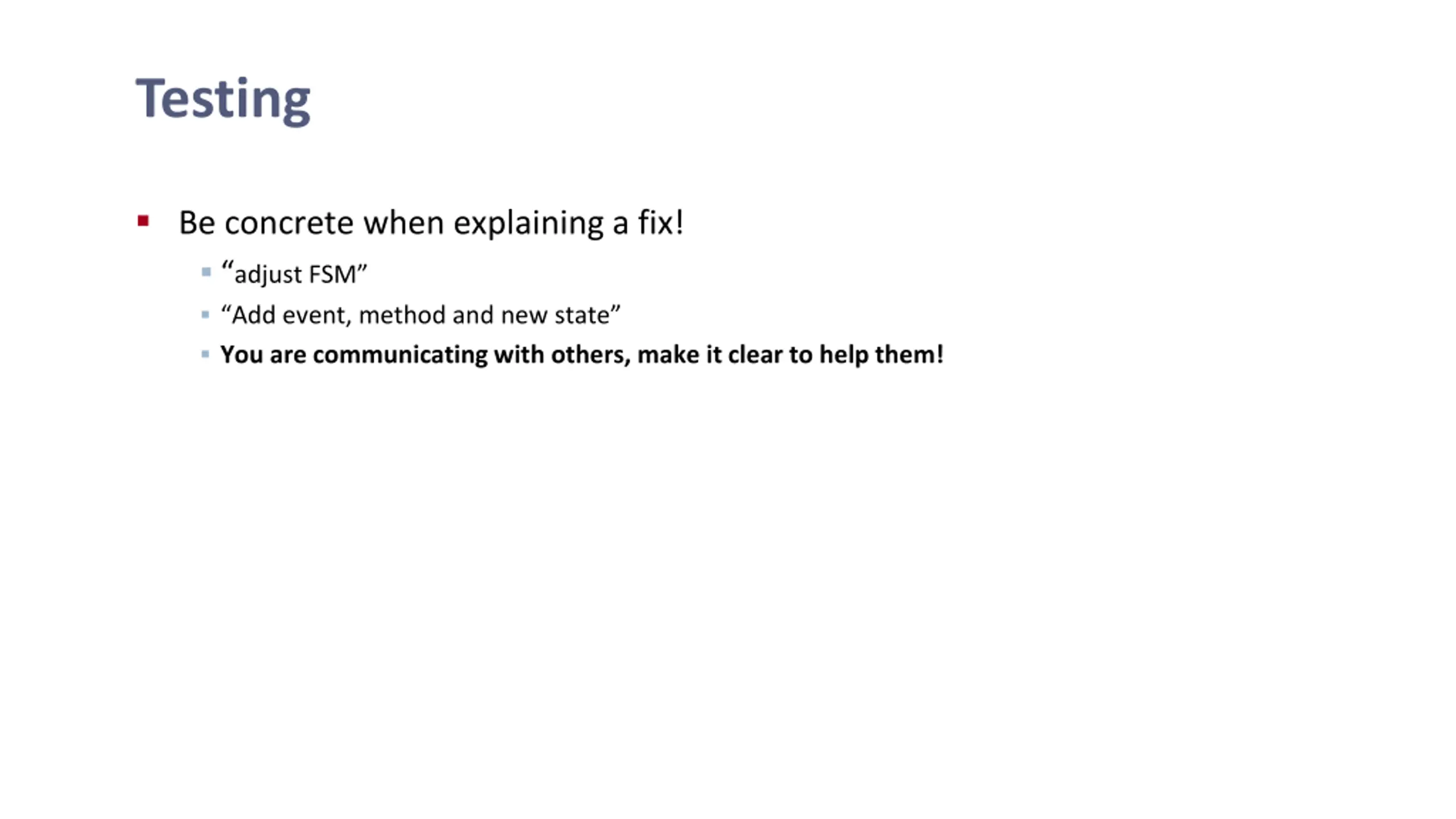 Testing Be concrete when explaining a fix! adjust FSM Add event, method and new state You are communicating with others, make it clear to help them!