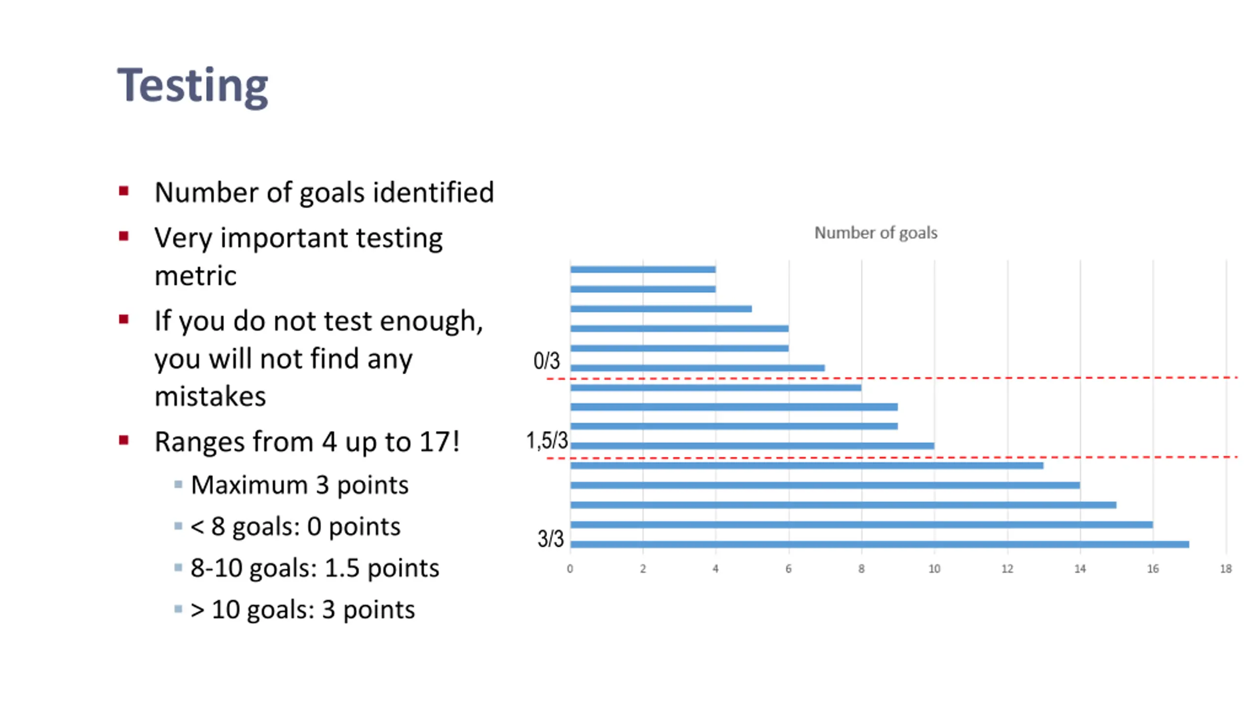Testing Number of goals identified Very important testing metric If you do not test enough, you will not find any mistakes Ranges from 4 up to 17! Maximum 3 points < 8 goals: 0 points 8-10 goals: 1.5 points > 10 goals: 3 points 0/3 1,5/3 3/3