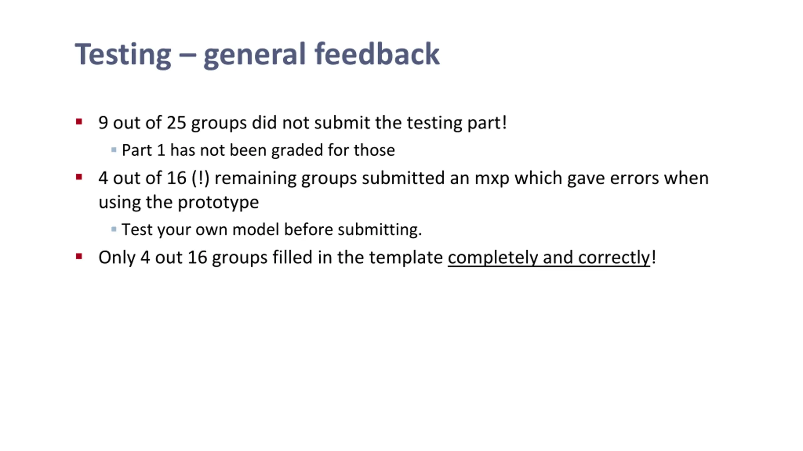 Testing general feedback 9 out of 25 groups did not submit the testing part! Part 1 has not been graded for those 4 out of 16 (!) remaining groups submitted an mxp which gave errors when using the prototype Test your own model before submitting. Only 4 out 16 groups filled in the template completely and correctly!