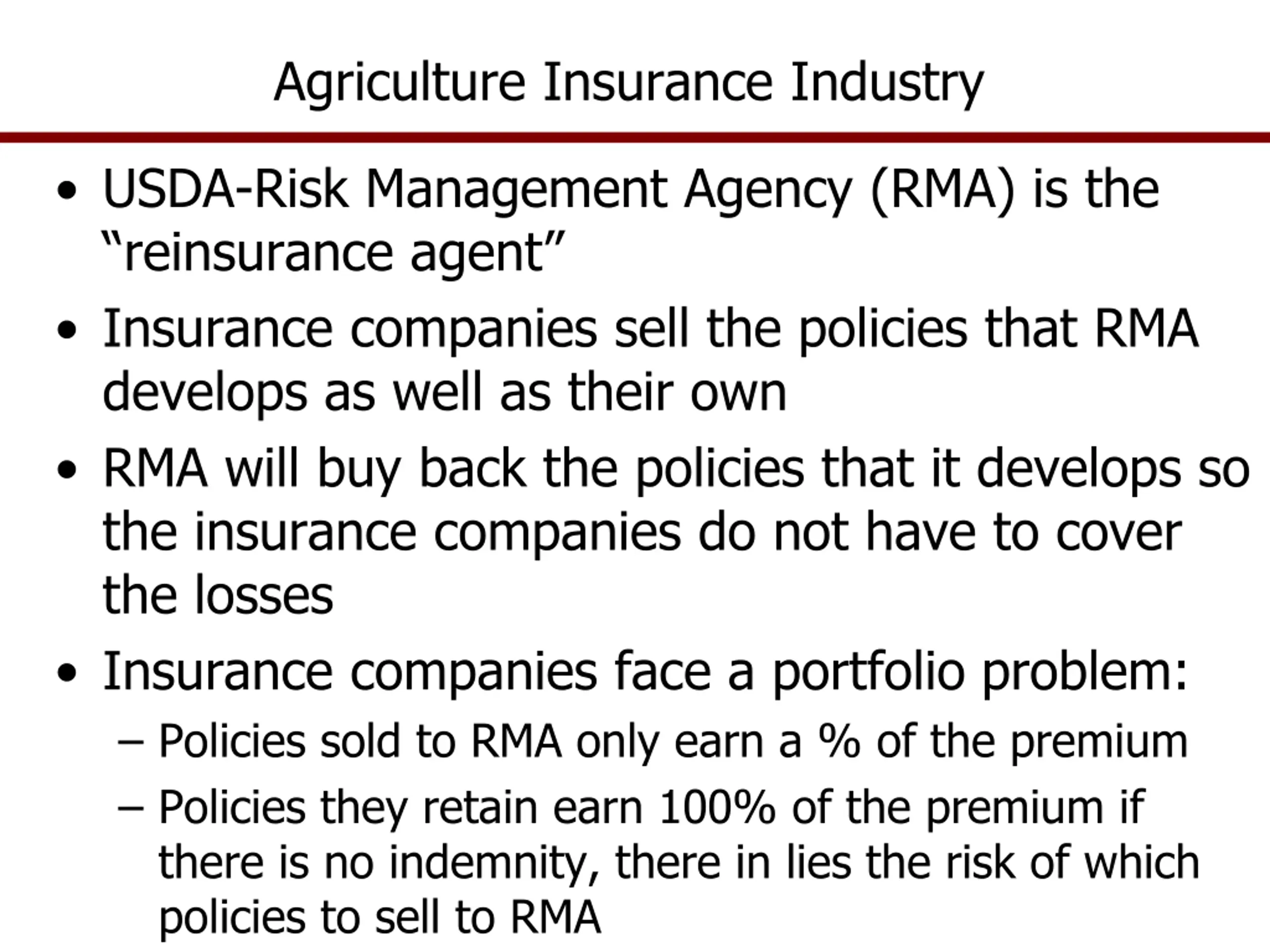Agriculture Insurance Industry USDA-Risk Management Agency (RMA) is the reinsurance agent Insurance companies sell the policies that RMA develops as well as their own RMA will buy back the policies that it develops so the insurance companies do not have to cover the losses Insurance companies face a portfolio problem: Policies sold to RMA only earn a % of the premium Policies they retain earn 100% of the premium if there is no indemnity, there in lies the risk of which policies to sell to RMA