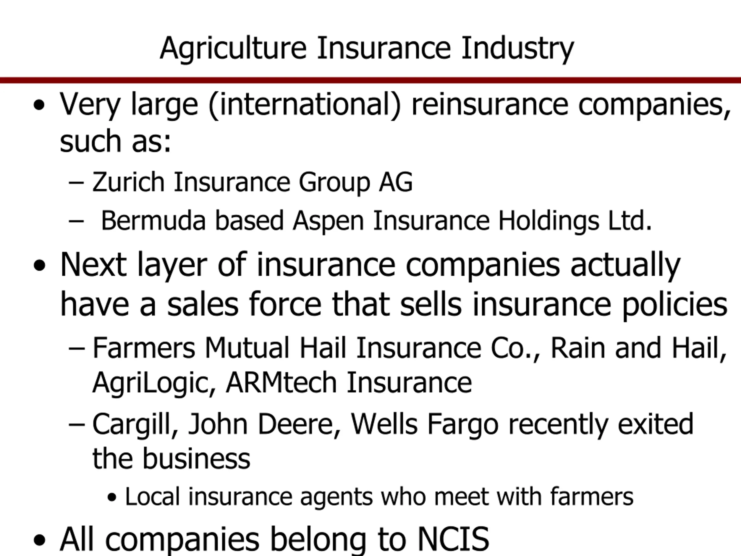 Agriculture Insurance Industry Very large (international) reinsurance companies, such as: Zurich Insurance Group AG Bermuda based Aspen Insurance Holdings Ltd. Next layer of insurance companies actually have a sales force that sells insurance policies Farmers Mutual Hail Insurance Co., Rain and Hail, AgriLogic, ARMtech Insurance Cargill, John Deere, Wells Fargo recently exited the business Local insurance agents who meet with farmers All companies belong to NCIS