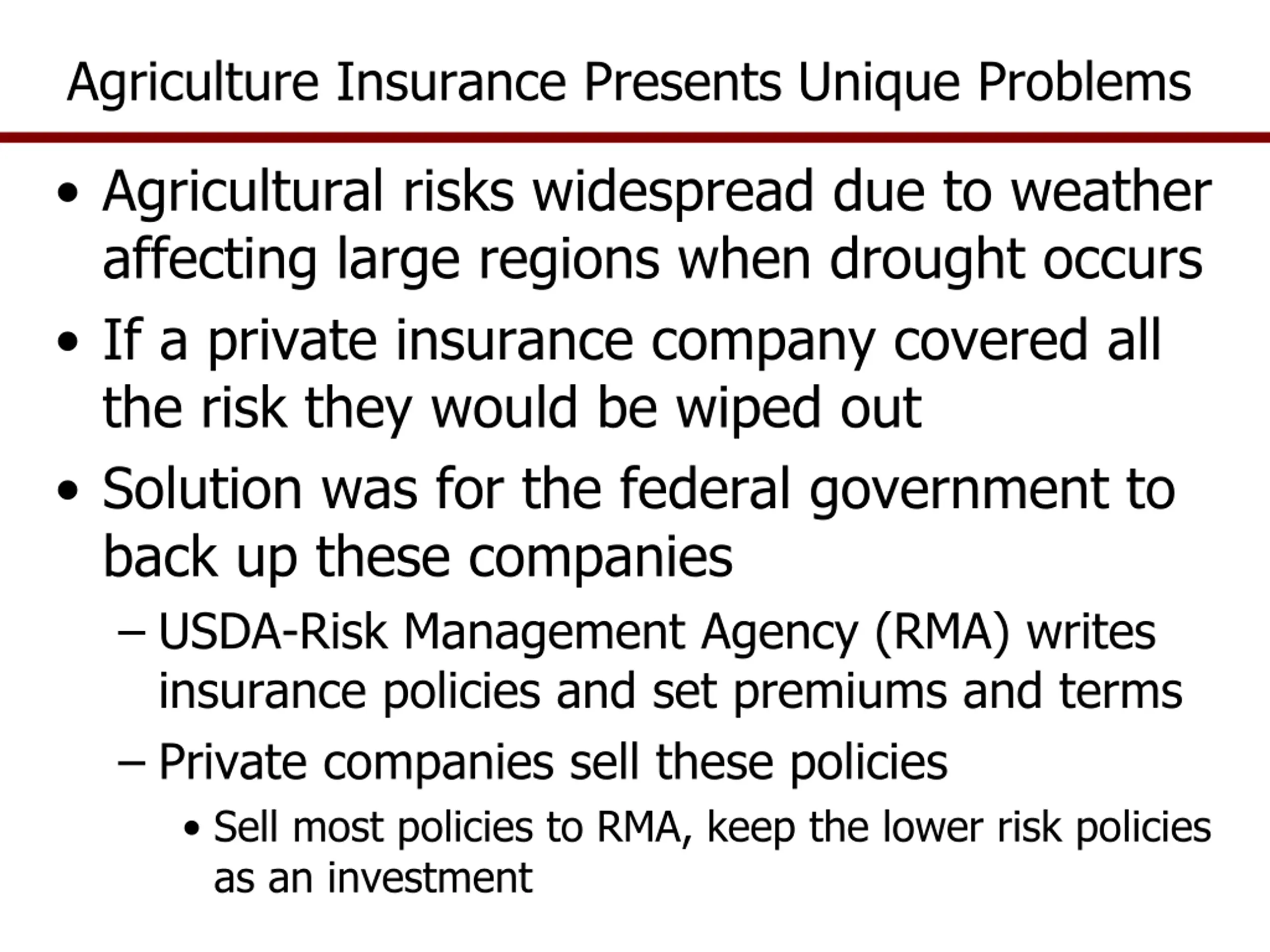 Agriculture Insurance Presents Unique Problems Agricultural risks widespread due to weather affecting large regions when drought occurs If a private insurance company covered all the risk they would be wiped out Solution was for the federal government to back up these companies USDA-Risk Management Agency (RMA) writes insurance policies and set premiums and terms Private companies sell these policies Sell most policies to RMA, keep the lower risk policies as an investment