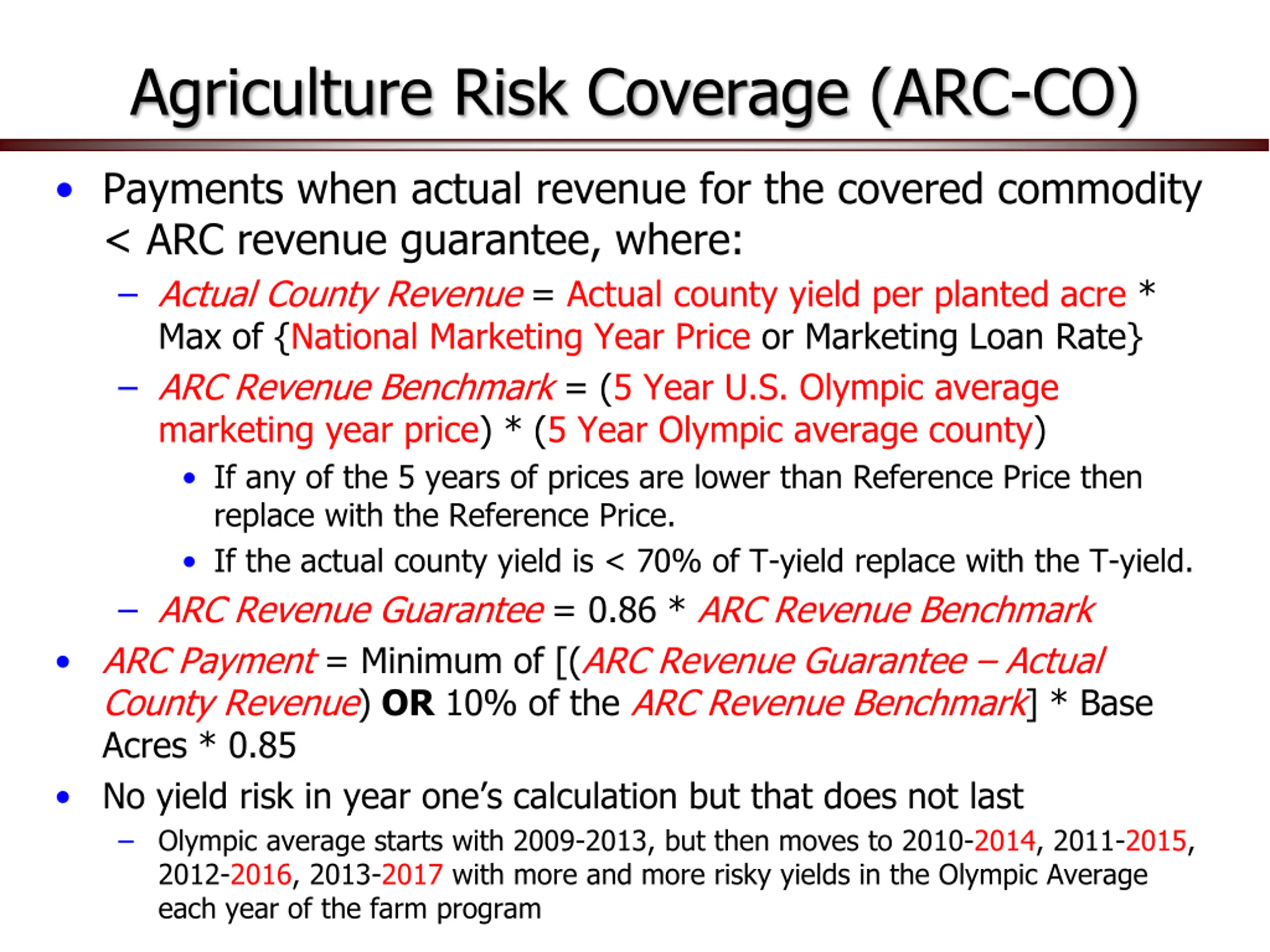 Agriculture Risk Coverage (ARC-CO) Payments when actual revenue for the covered commodity < ARC revenue guarantee, where: Actual County Revenue = Actual county yield per planted acre * Max of {National Marketing Year Price or Marketing Loan Rate} ARC Revenue Benchmark = (5 Year U.S. Olympic average marketing year price) * (5 Year Olympic average county) If any of the 5 years of prices are lower than Reference Price then replace with the Reference Price. If the actual county yield is < 70% of T-yield replace with the T-yield. ARC Revenue Guarantee = 0.86 * ARC Revenue Benchmark ARC Payment = Minimum of [(ARC Revenue Guarantee Actual County Revenue) OR 10% of the ARC Revenue Benchmark] * Base Acres * 0.85 No yield risk in year one s calculation but that does not last Olympic average starts with 2009-2013, but then moves to 2010-2014, 2011-2015, 2012-2016, 2013-2017 with more and more risky yields in the Olympic Average each year of the farm program