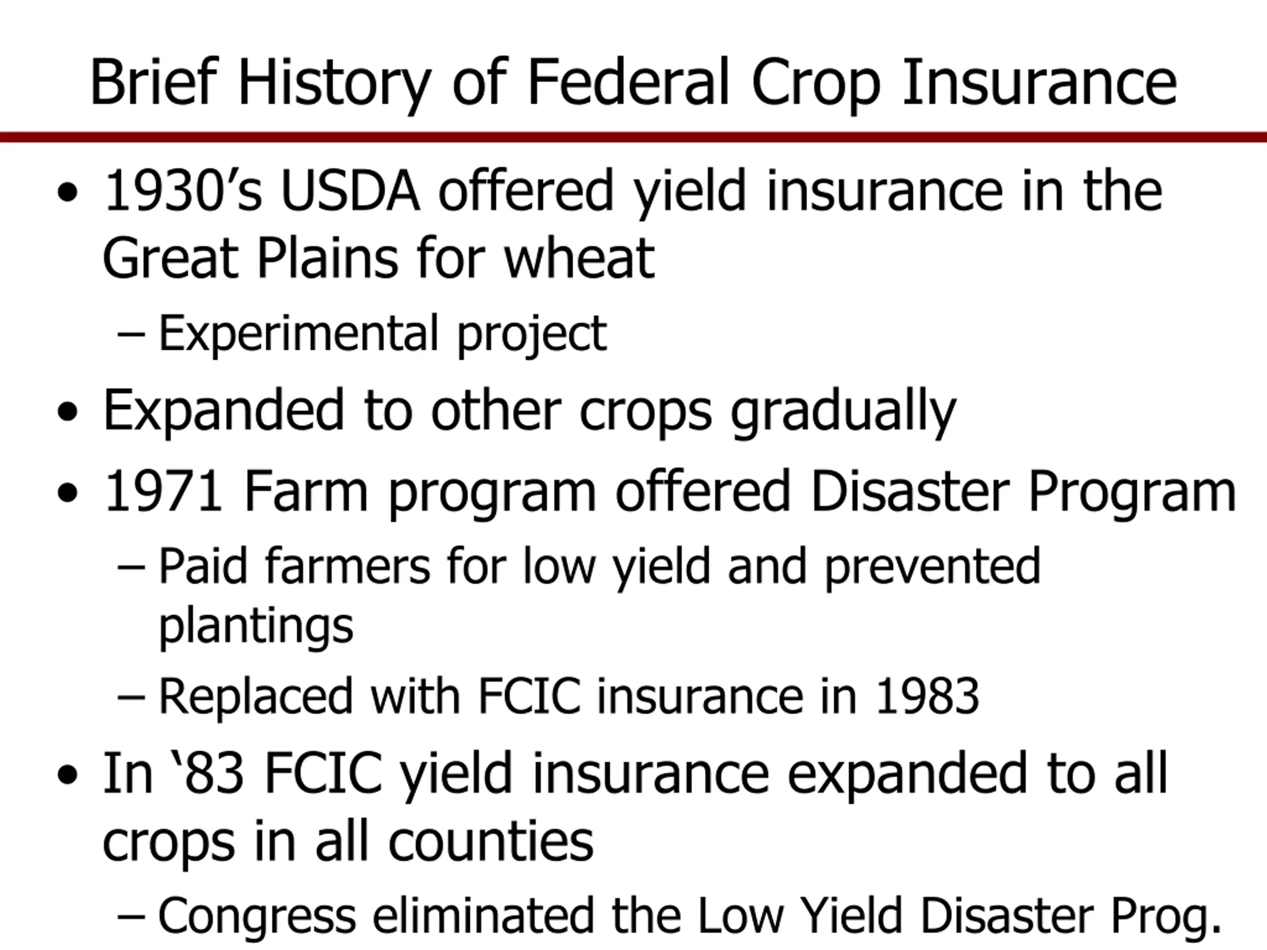 Brief History of Federal Crop Insurance 1930 s USDA offered yield insurance in the Great Plains for wheat Experimental project Expanded to other crops gradually 1971 Farm program offered Disaster Program Paid farmers for low yield and prevented plantings Replaced with FCIC insurance in 1983 In 83 FCIC yield insurance expanded to all crops in all counties Congress eliminated the Low Yield Disaster Prog.