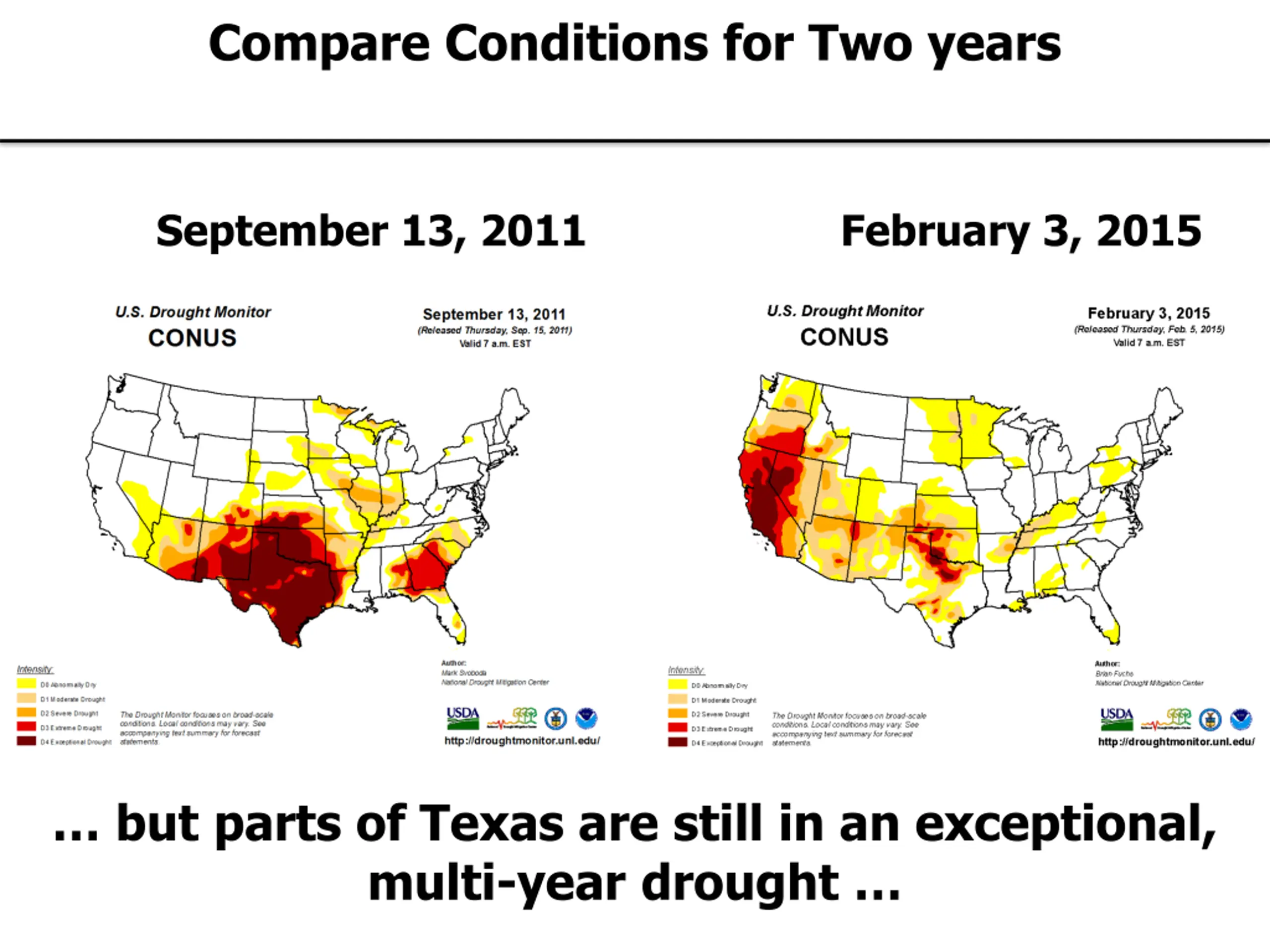 Compare Conditions for Two years September 13, 2011 February 3, 2015 but parts of Texas are still in an exceptional, multi-year drought
