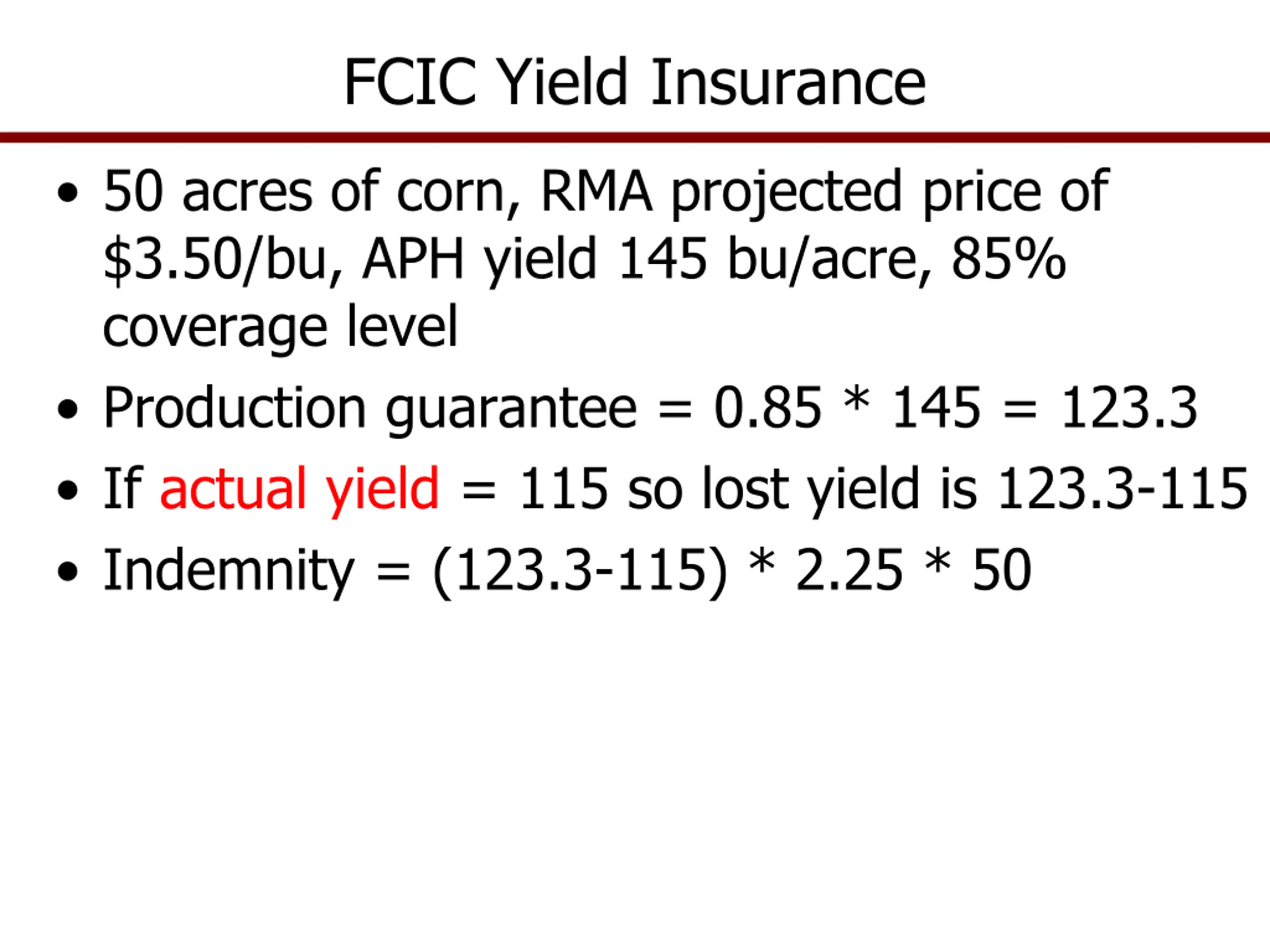FCIC Yield Insurance 50 acres of corn, RMA projected price of $3.50/bu, APH yield 145 bu/acre, 85% coverage level Production guarantee = 0.85 * 145 = 123.3 If actual yield = 115 so lost yield is 123.3-115 Indemnity = (123.3-115) * 2.25 * 50