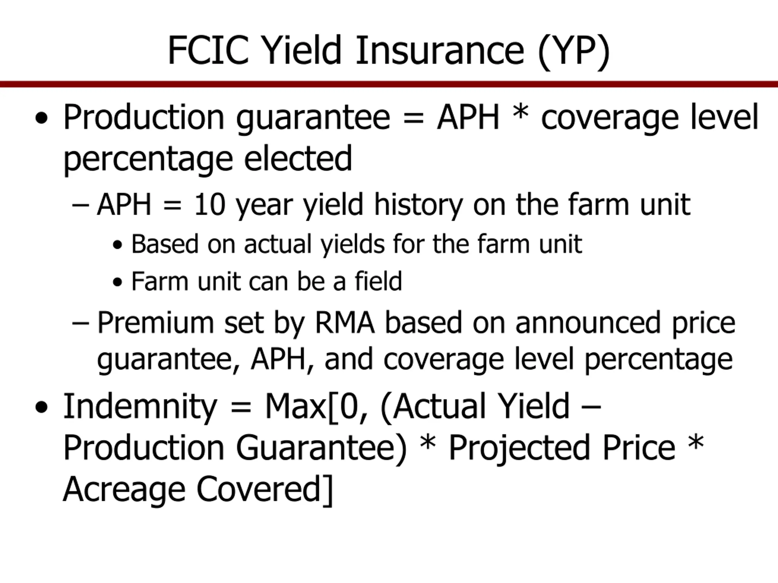 FCIC Yield Insurance (YP) Production guarantee = APH * coverage level percentage elected APH = 10 year yield history on the farm unit Based on actual yields for the farm unit Farm unit can be a field Premium set by RMA based on announced price guarantee, APH, and coverage level percentage Indemnity = Max[0, (Actual Yield Production Guarantee) * Projected Price * Acreage Covered]