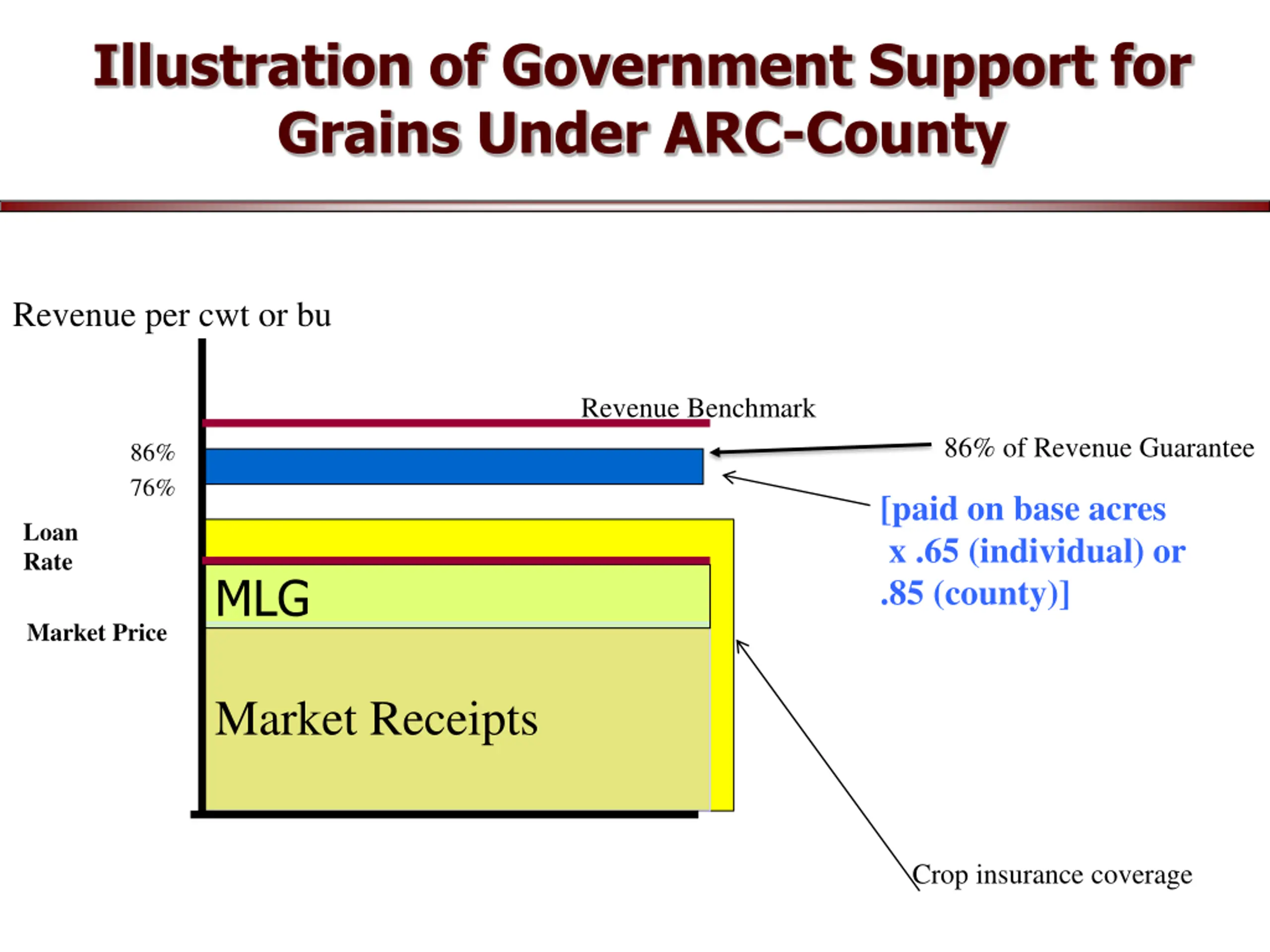Illustration of Government Support for Grains Under ARC-County Revenue per cwt or bu Revenue Benchmark 86% of Revenue Guarantee 86% 76% [paid on base acres x .65 (individual) or .85 (county)] Loan Rate MLG Market Price Market Receipts Crop insurance coverage
