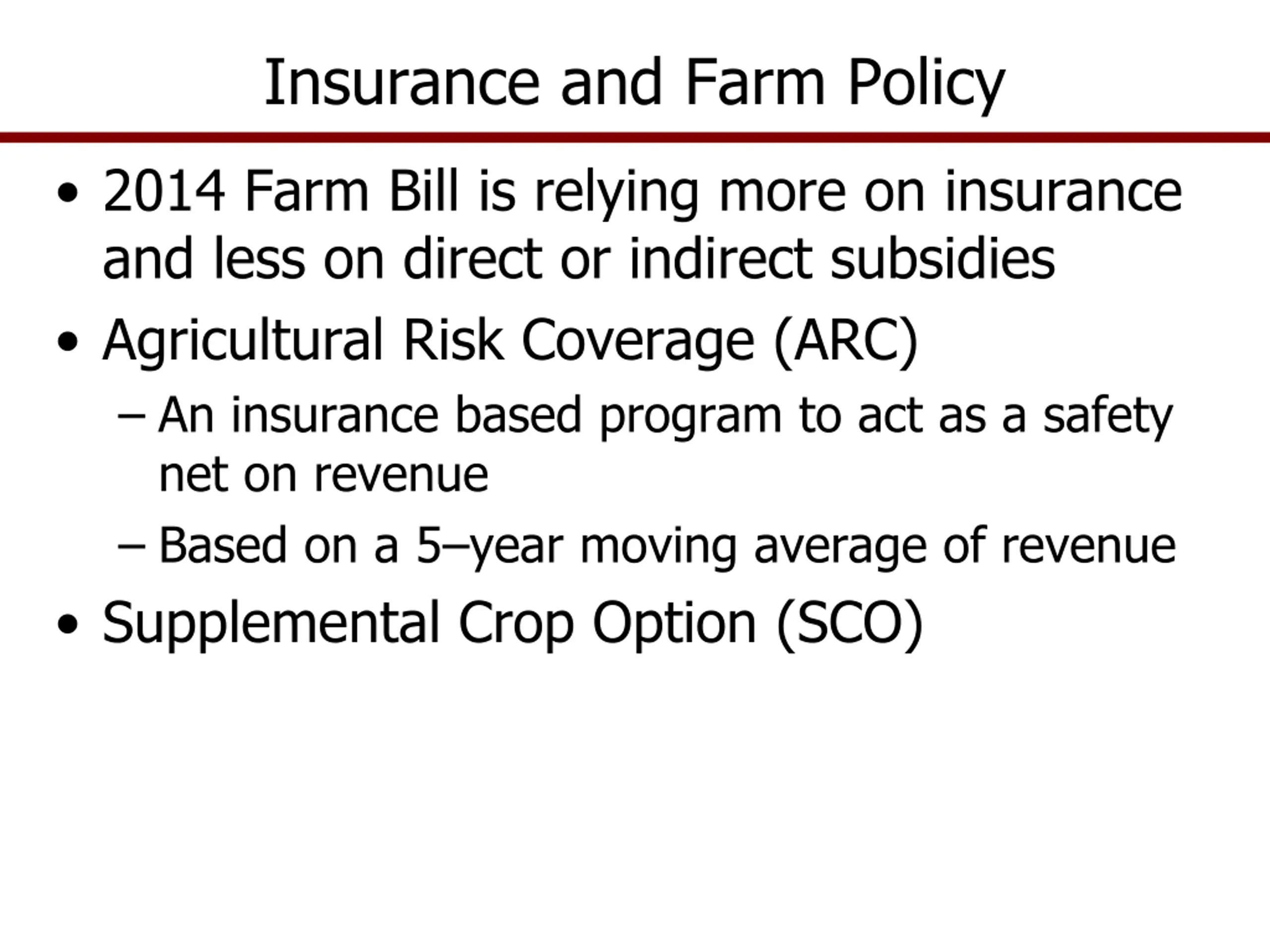 Insurance and Farm Policy 2014 Farm Bill is relying more on insurance and less on direct or indirect subsidies Agricultural Risk Coverage (ARC) An insurance based program to act as a safety net on revenue Based on a 5 year moving average of revenue Supplemental Crop Option (SCO)