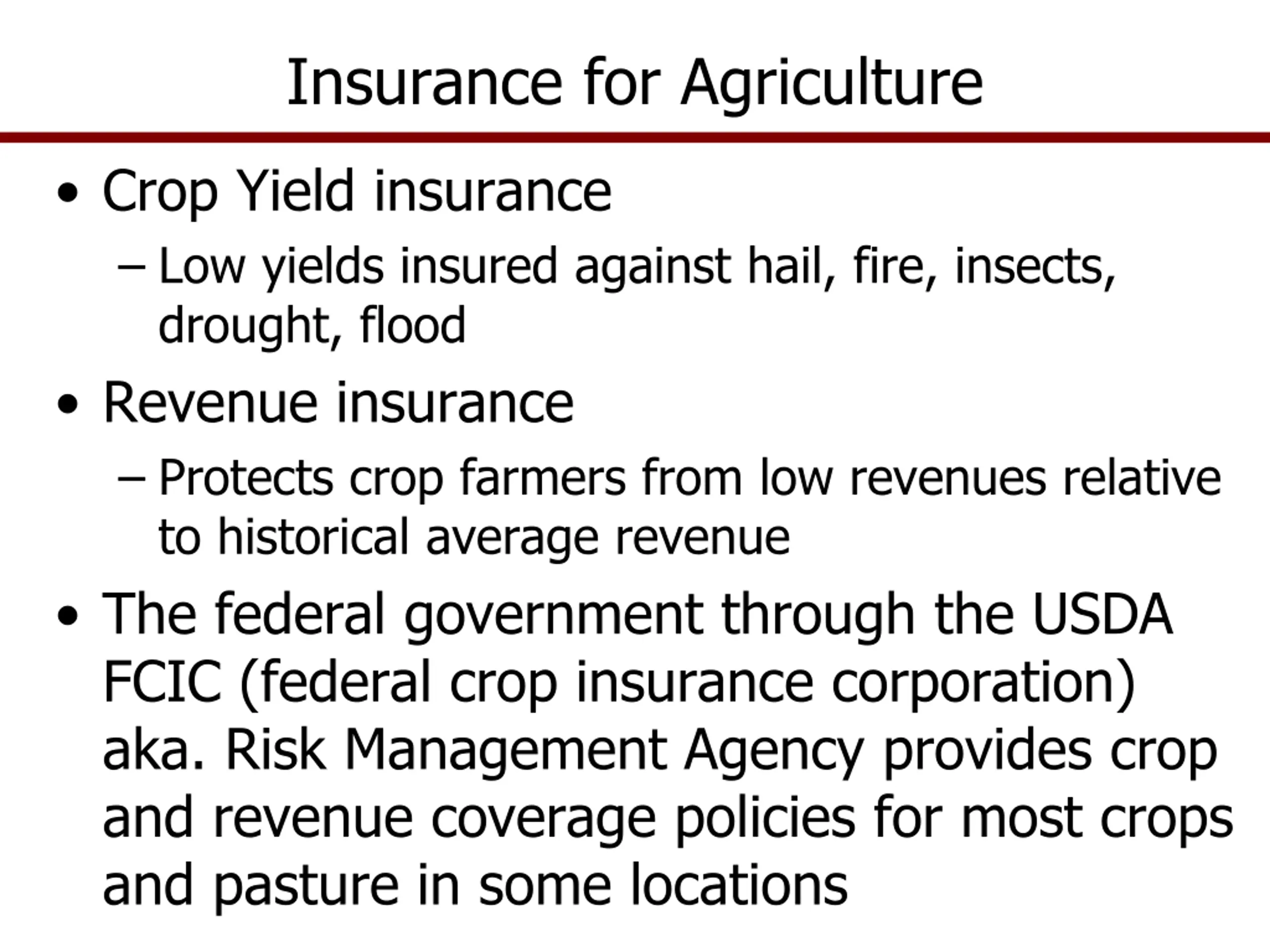 Insurance for Agriculture Crop Yield insurance Low yields insured against hail, fire, insects, drought, flood Revenue insurance Protects crop farmers from low revenues relative to historical average revenue The federal government through the USDA FCIC (federal crop insurance corporation) aka. Risk Management Agency provides crop and revenue coverage policies for most crops and pasture in some locations