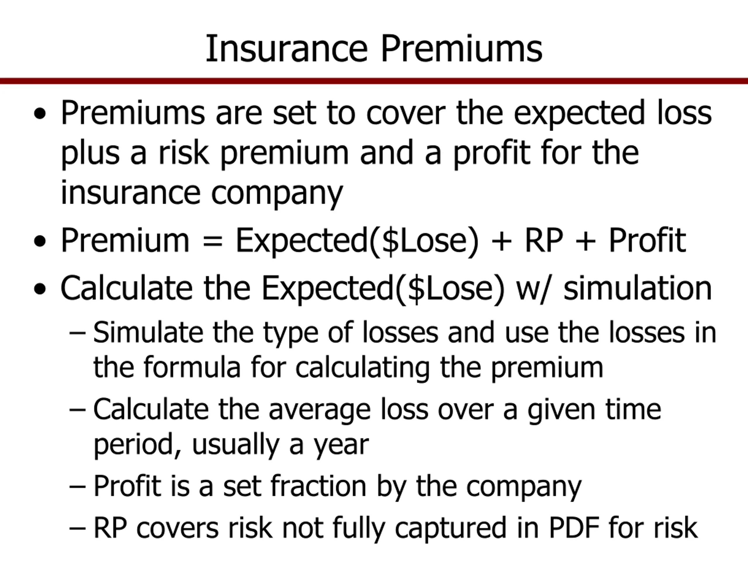Insurance Premiums Premiums are set to cover the expected loss plus a risk premium and a profit for the insurance company Premium = Expected($Lose) + RP + Profit Calculate the Expected($Lose) w/ simulation Simulate the type of losses and use the losses in the formula for calculating the premium Calculate the average loss over a given time period, usually a year Profit is a set fraction by the company RP covers risk not fully captured in PDF for risk