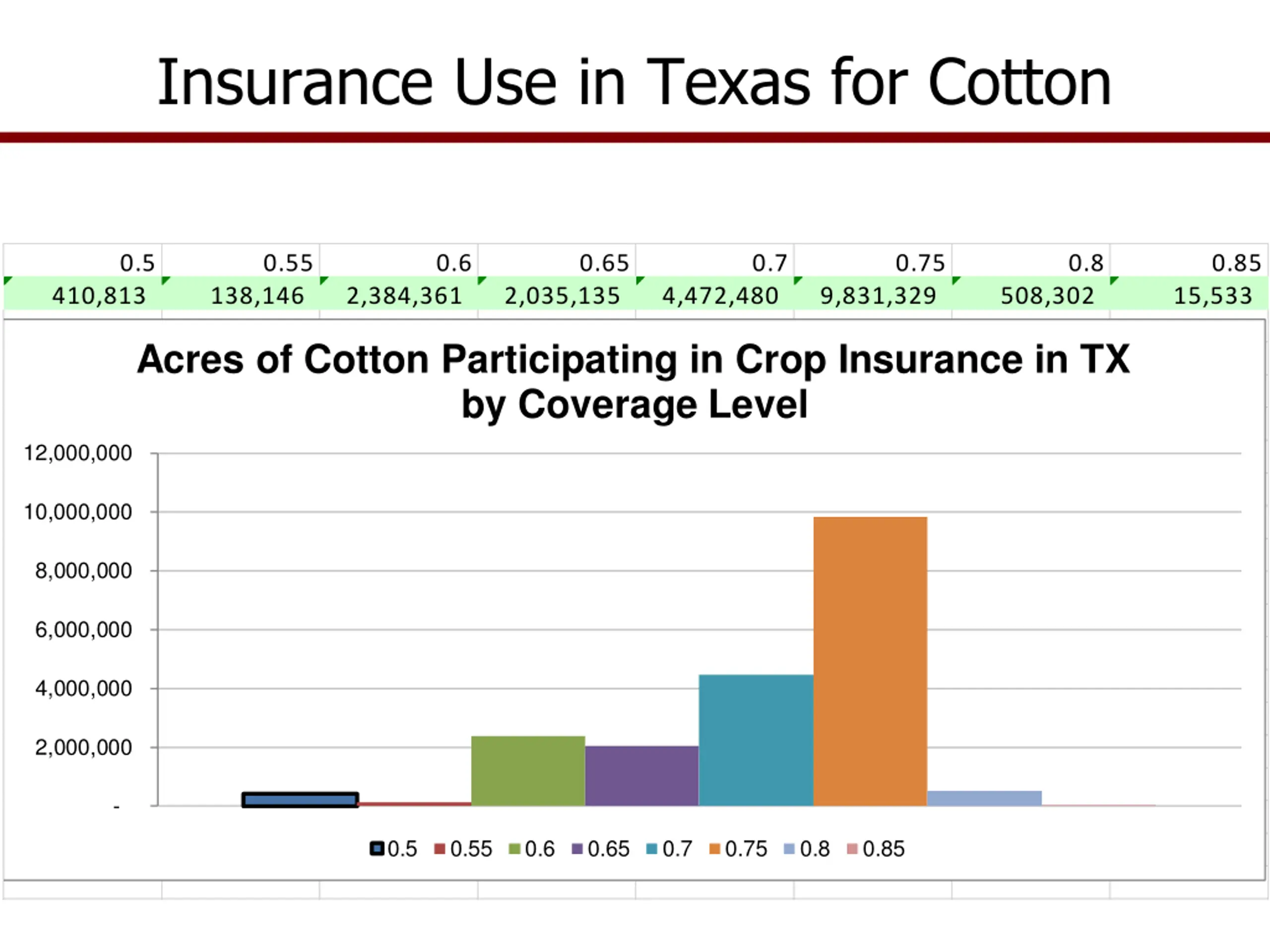 Insurance Use in Texas for Cotton 0.5 0.55 0.6 0.65 0.7 0.75 0.8 0.85 410,813 138,146 2,384,361 2,035,135 4,472,480 9,831,329 508,302 15,533 Acres of Cotton Participating in Crop Insurance in TX by Coverage Level 12,000,000 10,000,000 240 650 8,000,000 23249 4146 113 6,000,000 4,000,000 14 465 105 2,000,000 4 - 170 387 44 0.5 0.55 0.6 0.65 0.7 0.75 0.8 0.85