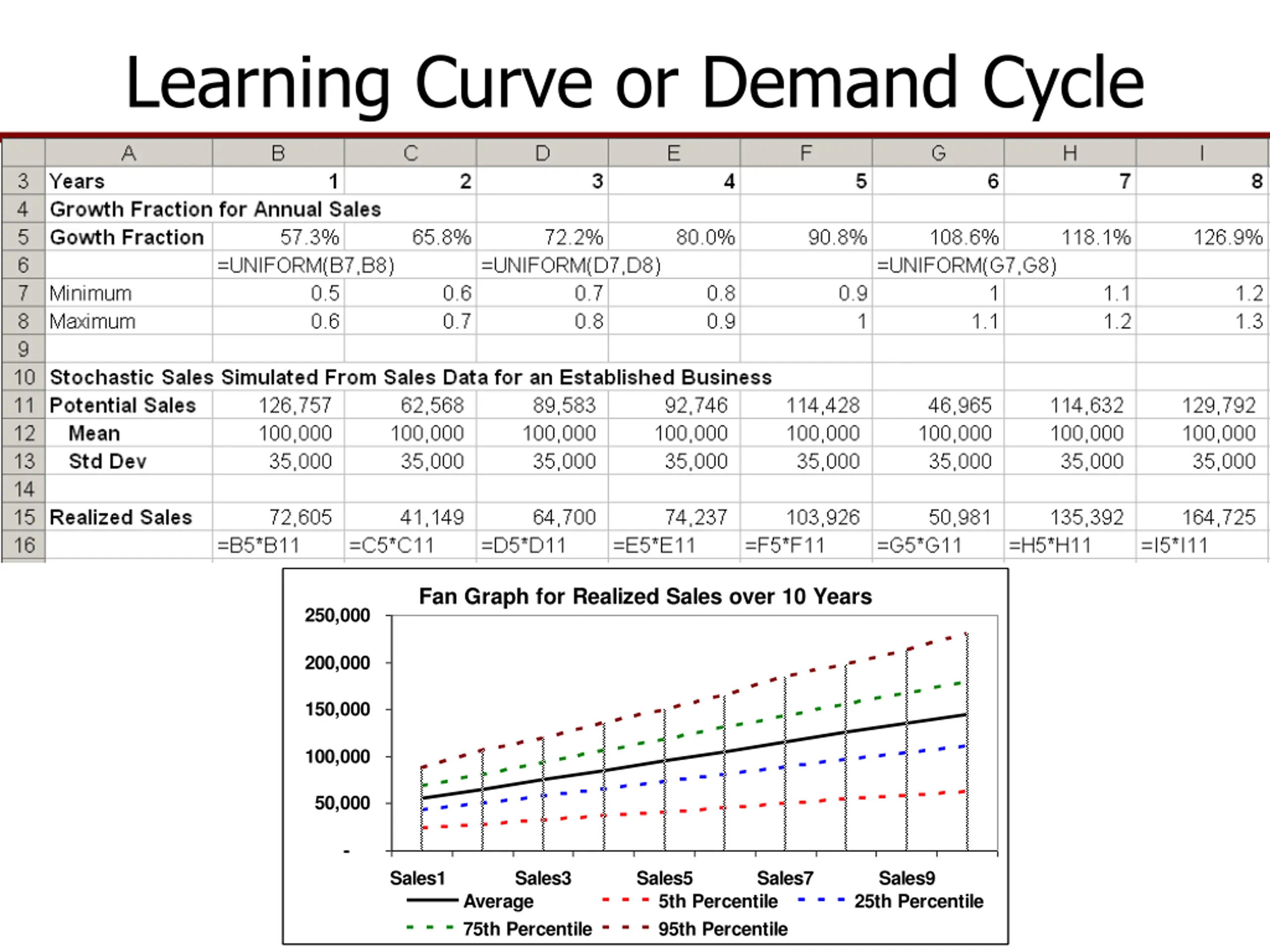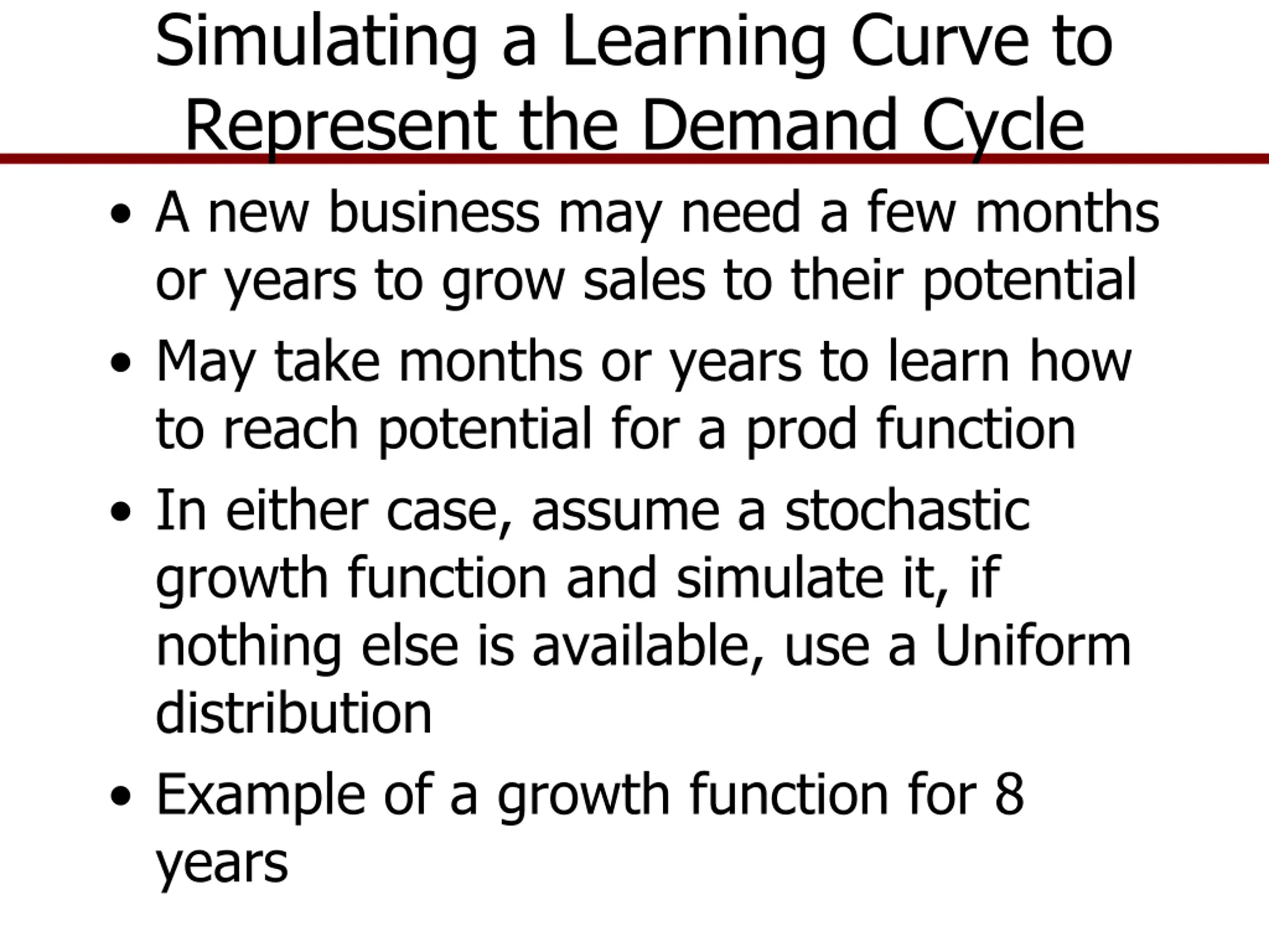 Simulating a Learning Curve to Represent the Demand Cycle A new business may need a few months or years to grow sales to their potential May take months or years to learn how to reach potential for a prod function In either case, assume a stochastic growth function and simulate it, if nothing else is available, use a Uniform distribution Example of a growth function for 8 years