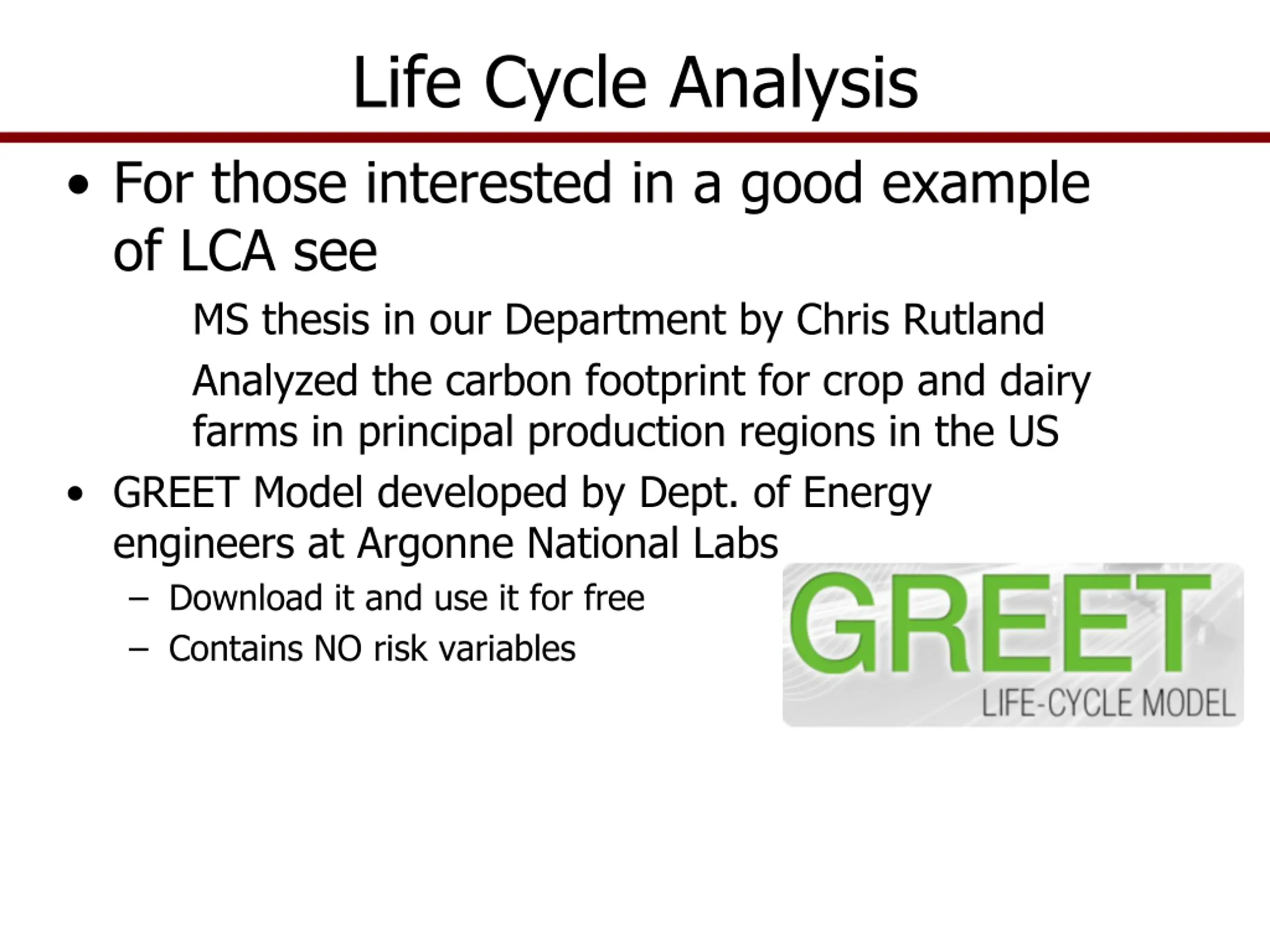 Life Cycle Analysis For those interested in a good example of LCA see MS thesis in our Department by Chris Rutland Analyzed the carbon footprint for crop and dairy farms in principal production regions in the US GREET Model developed by Dept. of Energy engineers at Argonne National Labs Download it and use it for free Contains NO risk variables
