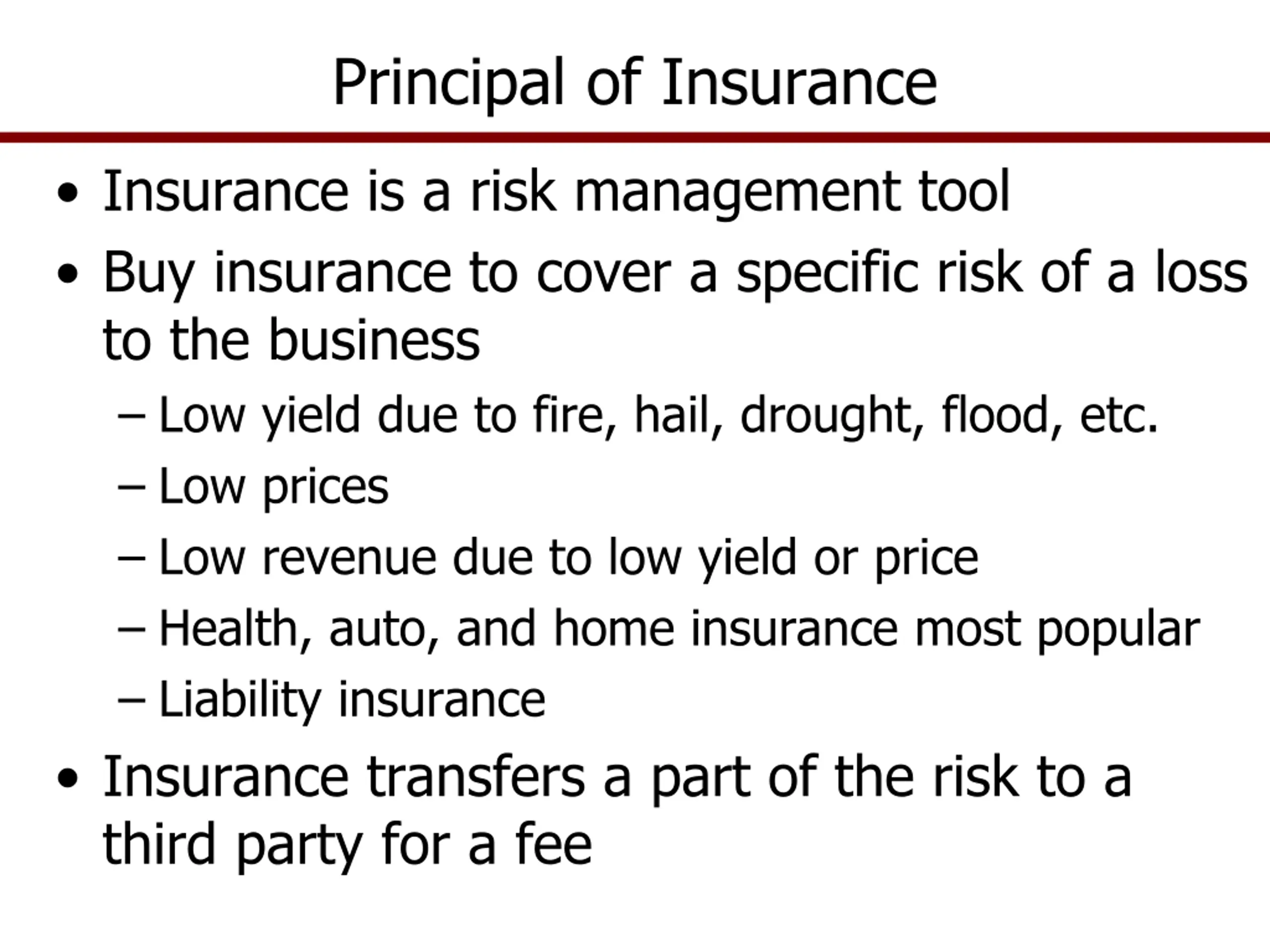 Principal of Insurance Insurance is a risk management tool Buy insurance to cover a specific risk of a loss to the business Low yield due to fire, hail, drought, flood, etc. Low prices Low revenue due to low yield or price Health, auto, and home insurance most popular Liability insurance Insurance transfers a part of the risk to a third party for a fee