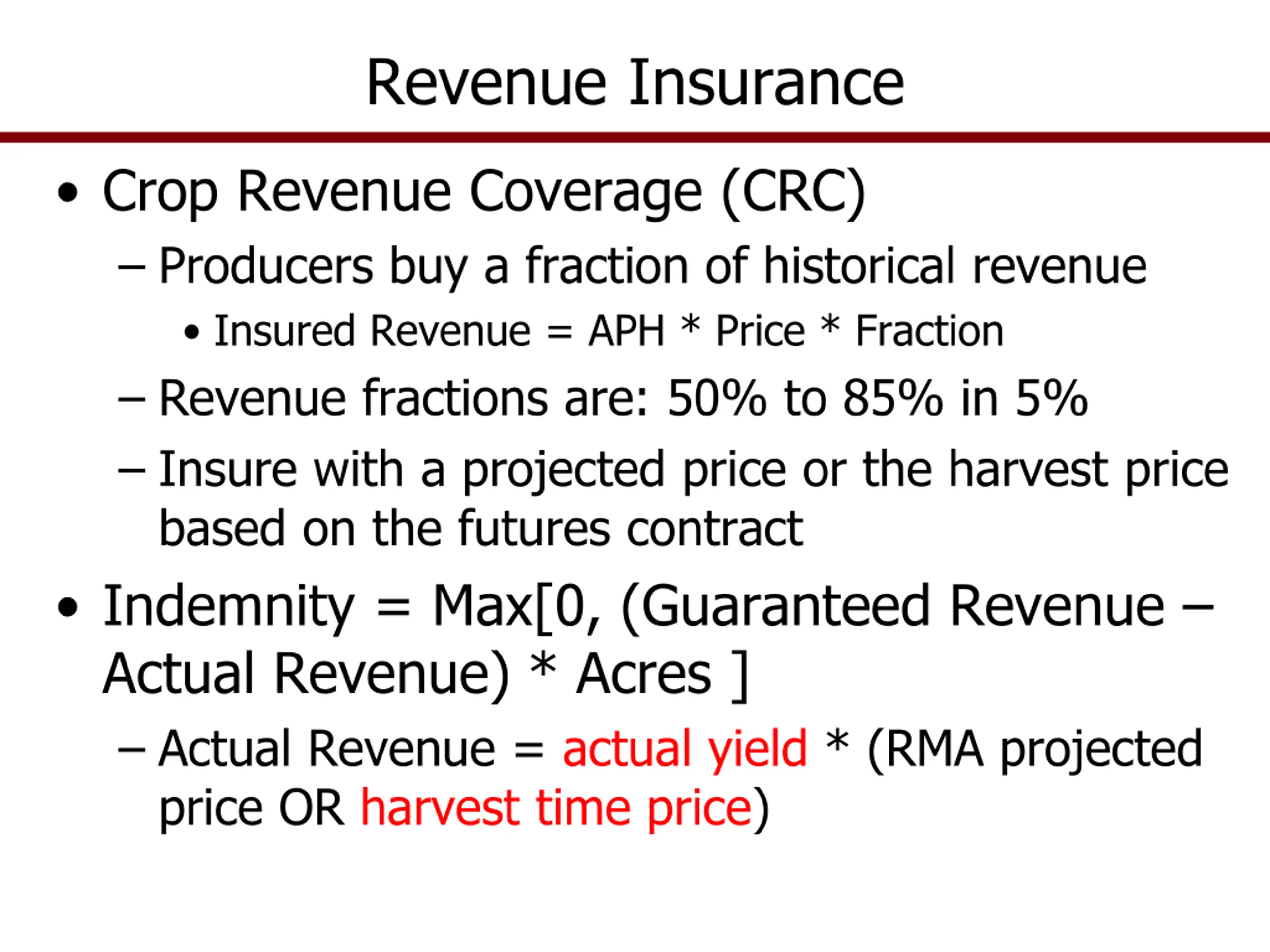 Revenue Insurance Crop Revenue Coverage (CRC) Producers buy a fraction of historical revenue Insured Revenue = APH * Price * Fraction Revenue fractions are: 50% to 85% in 5% Insure with a projected price or the harvest price based on the futures contract Indemnity = Max[0, (Guaranteed Revenue Actual Revenue) * Acres ] Actual Revenue = actual yield * (RMA projected price OR harvest time price)
