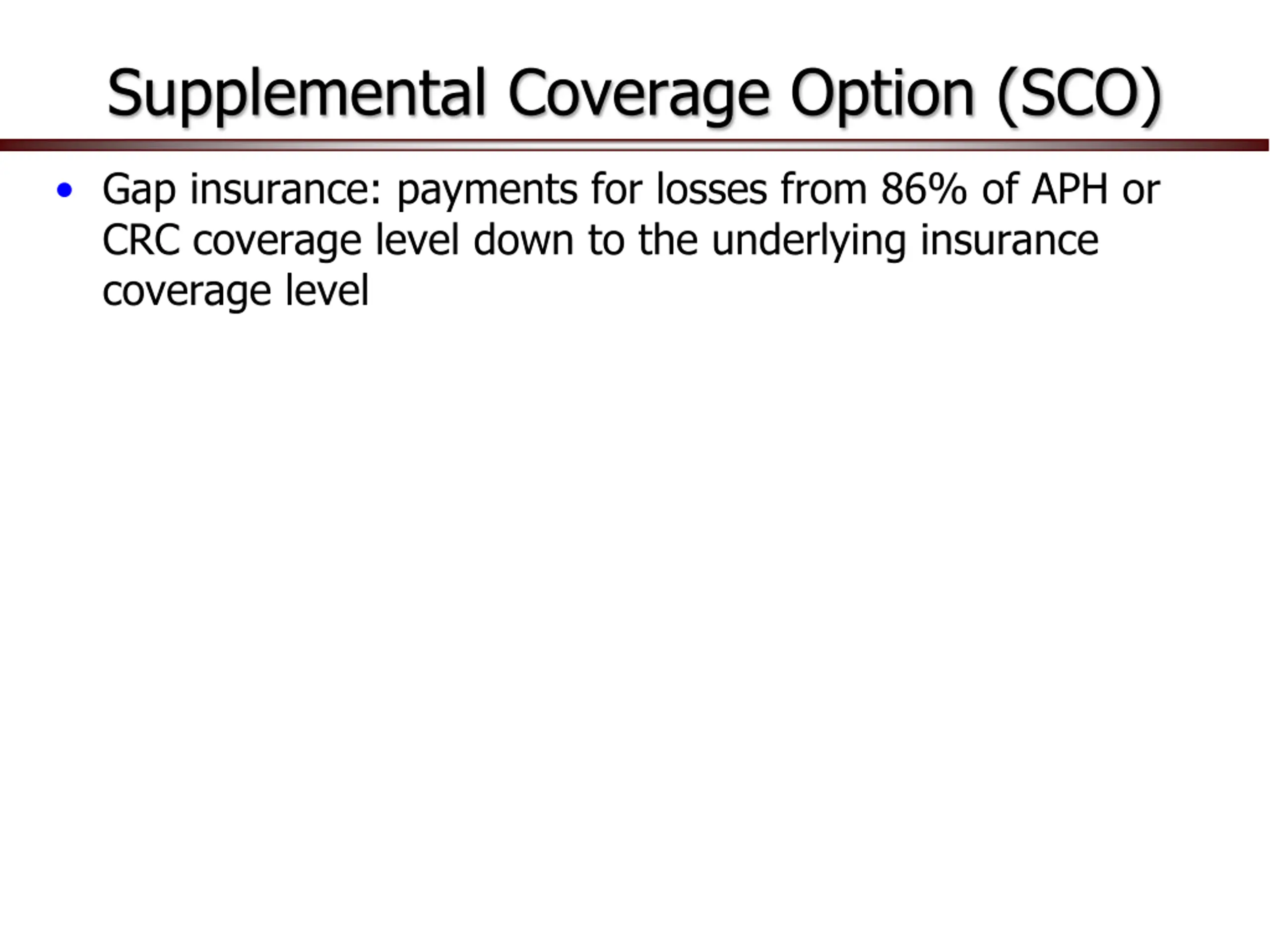 Supplemental Coverage Option (SCO) Gap insurance: payments for losses from 86% of APH or CRC coverage level down to the underlying insurance coverage level