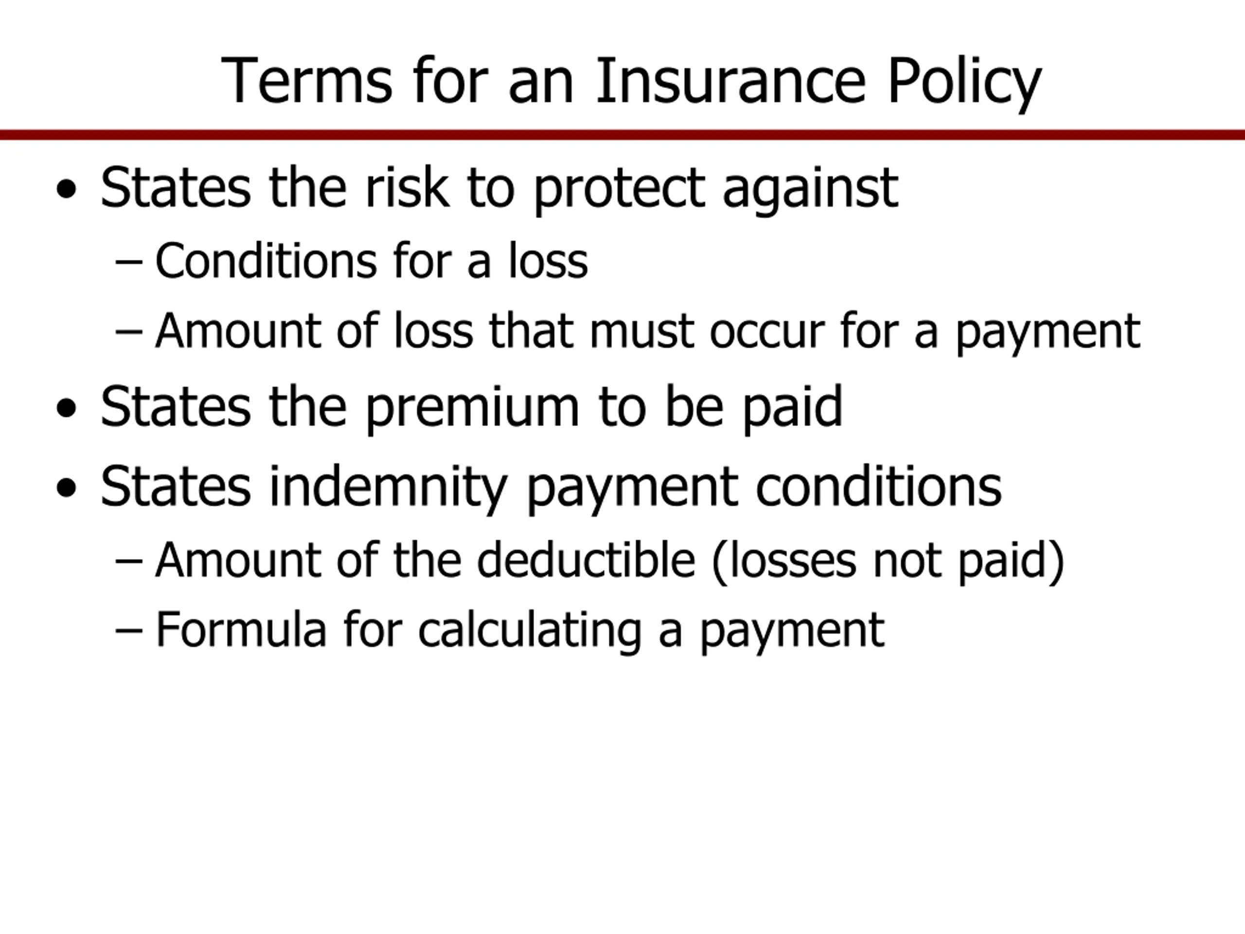 Terms for an Insurance Policy States the risk to protect against Conditions for a loss Amount of loss that must occur for a payment States the premium to be paid States indemnity payment conditions Amount of the deductible (losses not paid) Formula for calculating a payment