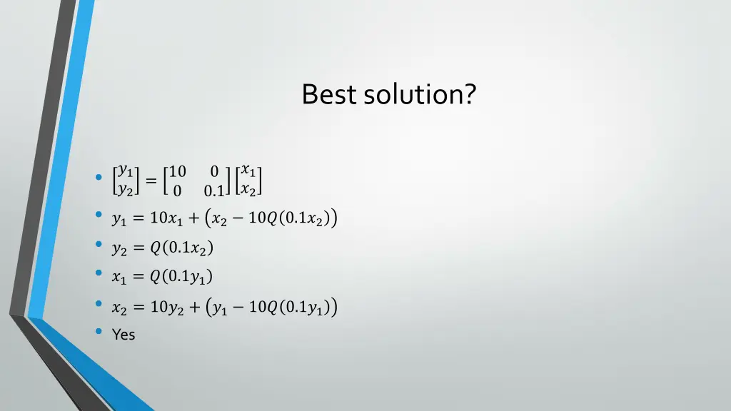 Best solution? ?1 ?2 ?1 ?2 =10 0 ?1= 10?1+ ?2 10? 0.1?2 ?2= ? 0.1?2 ?1= ? 0.1?1 ?2= 10?2+ ?1 10? 0.1?1 Yes 0 0.1