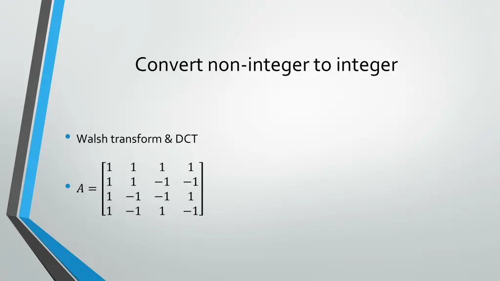 Convert non-integer to integer Walsh transform & DCT 1 1 1 1 1 1 1 1 1 1 1 1 1 1 ? = 1 1
