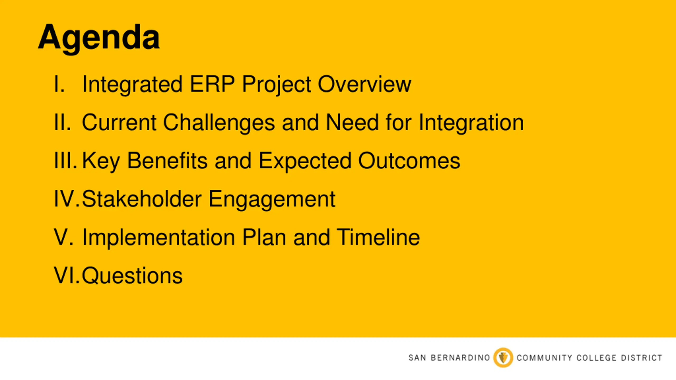 Agenda I. Integrated ERP Project Overview II. Current Challenges and Need for Integration III.Key Benefits and Expected Outcomes IV.Stakeholder Engagement V. Implementation Plan and Timeline VI.Questions