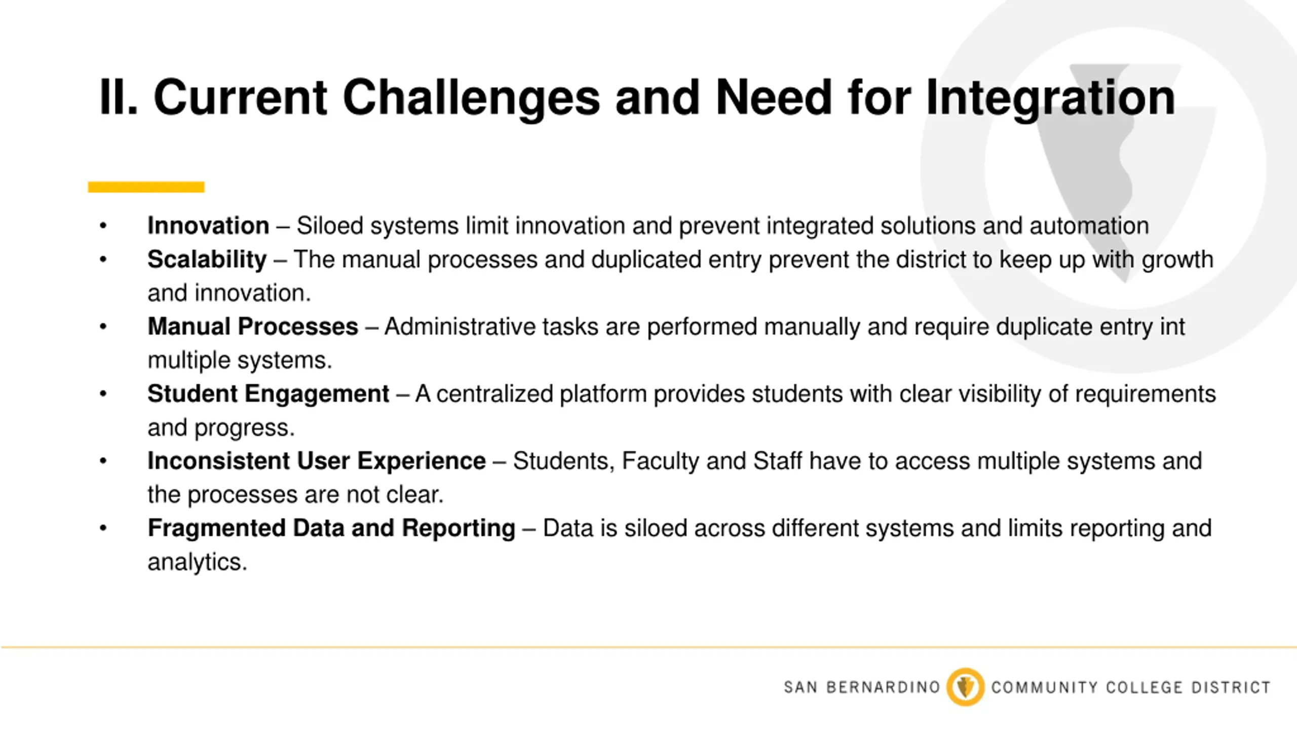 II. Current Challenges and Need for Integration Innovation Siloed systems limit innovation and prevent integrated solutions and automation Scalability The manual processes and duplicated entry prevent the district to keep up with growth and innovation. Manual Processes Administrative tasks are performed manually and require duplicate entry int multiple systems. Student Engagement A centralized platform provides students with clear visibility of requirements and progress. Inconsistent User Experience Students, Faculty and Staff have to access multiple systems and the processes are not clear. Fragmented Data and Reporting Data is siloed across different systems and limits reporting and analytics.